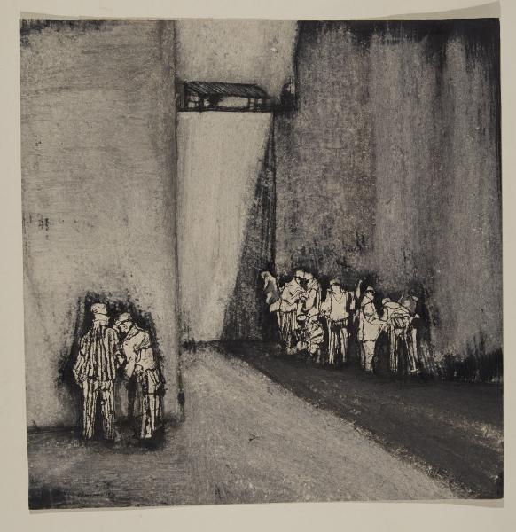 - NOTIZIE STORICO CRITICHE Renzo Vespignani inizia la sua attività artistica a soli diciannove anni quando, tra il 1943 e il 1944, nei nove mesi di occupazione nazista, disegna in centinaia di fogli le sporche periferie della capitale, gli orrori della guerra, il dramma degli sfollati e le rovine della città distrutta dai bombardamenti. Nel gennaio del 1945 tiene la sua prima mostra personale a Roma, la quale ne decreta l’ingresso nella scena culturale italiana come un caso anomalo e inaspettato dopo la stagione della Scuola Romana. In questo periodo Vespignani si dedica intensamente al bianco e nero, al disegno e all’acquaforte, mostrando un segno grafico secco, ispirato alle opere degli artisti dell’espressionismo tedesco, a Grosze e Dix in particolare, oltre che a Ensor. Le sue raffigurazioniopere, però, mantenendo un linguaggio ancora tipicamente romano, meno violento e politicizzato, rispetto a quello dei suoi modelli d’oltralpe. Dalla fine della guerra inizia per l’artista un susseguirsi di viaggi ed esposizioni personali e collettive in Europa e in America; nel 1950 partecipa alla XXV Biennale di Venezia, ricevendo il primo Premio del Bianco e Nero. Non ancora trentenne, nello stesso anno, prende parte alla Mostra internazionale del disegno moderno di Bergamo, presentando sei opere raffiguranti scorci e luogi di una Parigi desolata. É proprio in quell’occasione espositiva che le Civiche Raccolte pubbliche della città di Milano acquistano un’opera su carta dell’artista, insieme ad altri disegni di Mino Macari (inv.182 Recto), Aldo Salvadori (invv. 259, 308, 365) e Giuseppe Santomaso (inv. 367).\nNel disegno di Vespignani è ancora evidente la sintonia spirituale raggiunta con alcune soluzioni figurative dell’espressionismo tedesco e austriaco, non soltanto riferita all’ambito pittorico, ma estesa anche ad altri elementi culturali come il cinema. Il disegno, infatti, sembrerebbe ricordare alcuni fotogrammi di "Metropolis", film muto del 1927 diretto da Fritz Lang e capolavoro del cinema espressionista degli anni Venti. Al di là dei riferimenti iconografici "La prigione"di Vespignani si caratterizza come un’opera dalla forte connotazione psicologica, arricchita da un senso di esperienza viva e dolorosa. La definizione spaziale di quest’ultima è affidata a ombre oblique e a scuri profondi, nella quale la presenza dei prigionieri rappresentati serve semplicemente a dare una chiave di lettura dimenzionale dello spazio, oltre che a sottolineare il senso di solitudine e di provvisorietà dell’intera rappresentazione. In questo ampio spazio dove la demarcazione tra cielo e terra è quasi impossibile da individuare, grumi di colori grigiastri si contrappongono alle esigue sagome dei personaggi.