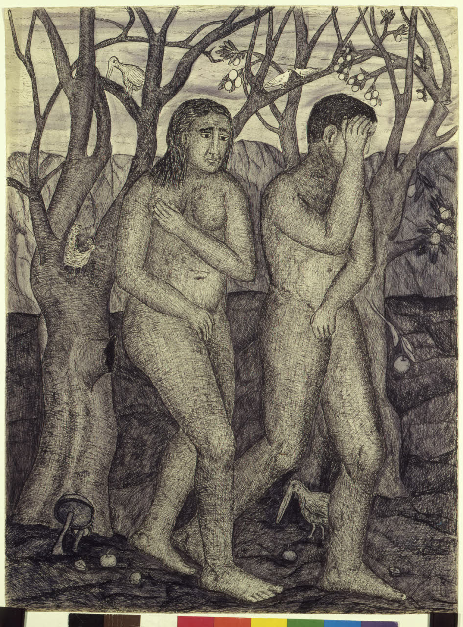 - NOTIZIE STORICO CRITICHE Il disegno "Adamo ed Eva scacciati dal Paradiso terrestre" di Fiorenzo Tomea è stato donato alle Civiche Raccolte d'Arte nel 1970 da Alfonso Orombelli, insieme ad altre due opere dell'artista: "Nudo femminile di schiena" (inv. Agg. 378) e "Cena in Emmaus" (inv. Agg. 432). Tali fogli, pur risentendo fortemente dell'influenza di Garberi si ricongiungono alle ricerche figurative sviluppate da Tomea intorno agli anni Trenta (Dallaj 1991). Nell'Adamo ed Eva, all'interno di un paesaggio alpino "si alternano funghi e mele cadorine, mentre un pavone simile a una fagianella e altre specie di alati sono appollaiati tra i rami". Inoltre "all'iconografia tradizionale con l'angelo dalla spada fiammeggiante, l'artista sostituisce un'immagine dolorosamente bucolica" (Pontiggia 1998). La scena si focalizza sulle figure dei due soggetti principali, i quali, nascondendo vergognati le proprie nudità, avanzano nel giardino meditando tristemente sulla loro colpa. Esse non risultano aggredite da stilizzazioni formali, ma sono pervase da un affiorare di masse toniche realizzate con un fittissimo tratteggio nero. L'opera comunica un senso di meditazione amara e una visione del mondo angosciante e pessimista.