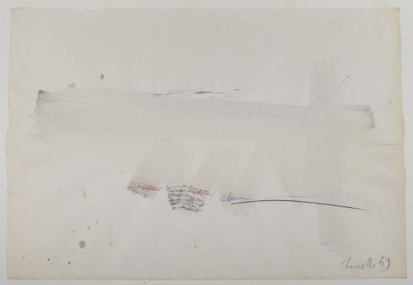 - NOTIZIE STORICO CRITICHE La produzione artistica di Gastone Novelli costituisce una delle ricerche espressive più rilevanti all’interno del panorama culturale italiano degli anni Cinquanta e Sessanta del secolo scorso. Esponente di punta della neoavanguardia, nonchè fondatore insieme ad Achille Perilli de "L’Esperienza Moderna" e de la "Grammatica" con Perilli, Giuliani e Manganelli (due delle riviste italiane più attente agli sviluppi della cultura contemporanea e alla "nuova figurazione"), Novelli elabora la sua opera come una nuova contrapposizione tra materia e gesto. Nelle sue pitture, così come nei suoi disegni, le forme e i segni sono carichi di vivacità espressiva e si concentrano verso nuove strutture semantiche di narrazione. Nel 1984 le civiche raccolte hanno acquistato da Giovanola Ripandelli, moglie dell’artista, otto opere su carta realizzate con tecnica mista. Queste ripercorrono la poetica creativa di Novelli all’interno di un periodo che va dal 1957 al 1968. Partendo da un atto informale, dove la creazione è concepita come energia di una nuova vita e superamento dell’antitesi tra figurativo e non figurativo, tali opere arrivano a un disegno che diventa scrittura, pensiero, concetto creativo. Se nei fogli della fine degli anni cinquanta (invv. 541, 542, 543) si osservano grumi materici di colore, grovigli di segni che affiorano latenti attreverso linee, nei fogli del decennio successivo (invv. 544, 545, 546, 547, 548) si assiste, invece, a un nuovo modo di lavorare, dove non è più possibile distinguere la scrittura dal disegno. \nIn alcuni fogli, ad esempio, (invv. 542, 543) spesse pennellate di colore diventano cancellature che lasciano affiorare simboli e macchie in trasparenza; in altri ancora (invv. 544, 545) il segno domina la composizione attraverso una scrittura automatica che diventa flusso di coscienza, il foglio bianco è diviso in settori ed è ricoperto da frasi e frammenti d’immagine. Infine, in altri (inv. 546, 548) la sagoma della montagna, con annotazioni e parole o quella della barca che galleggia in un mare di linee colorate, diventano simboli archetipi all’interno di un nuovo modo di comunicare . \nIl tratto del medium grafico con cui l’artista lavora è leggero, narrativo e sapiente; inoltre, come osservato da Massimo Bignardi, nelle sue opere grafiche "Gastone Novelli sottrae la linea al suo ruolo costruttivo, riducendo la presenza a mera traccia, corsiva e rapida apparizione, di minime annotazioni poste ai margini [...]. Il disegno diviene un processo d’immediato contatto, di facile fruire dell’immaginario e soprattutto delle energie sprigionate dagli stati profondi della psciche che vanno ad insinuarsi nei territori di fondi corposi, densamente plastici come avviene soprattutto nelle opere pittoriche"(Bignardi 1993, p. 292). Un’antologia della sua opera su carta è stata curata da Flamionio Gualdoni al Padiglione d’Arte Contemporanea di Milano nel 1983, occasione nella quale furono esposti anche alcuni dei fogli sopra citati (invv. 544, 545, 548).