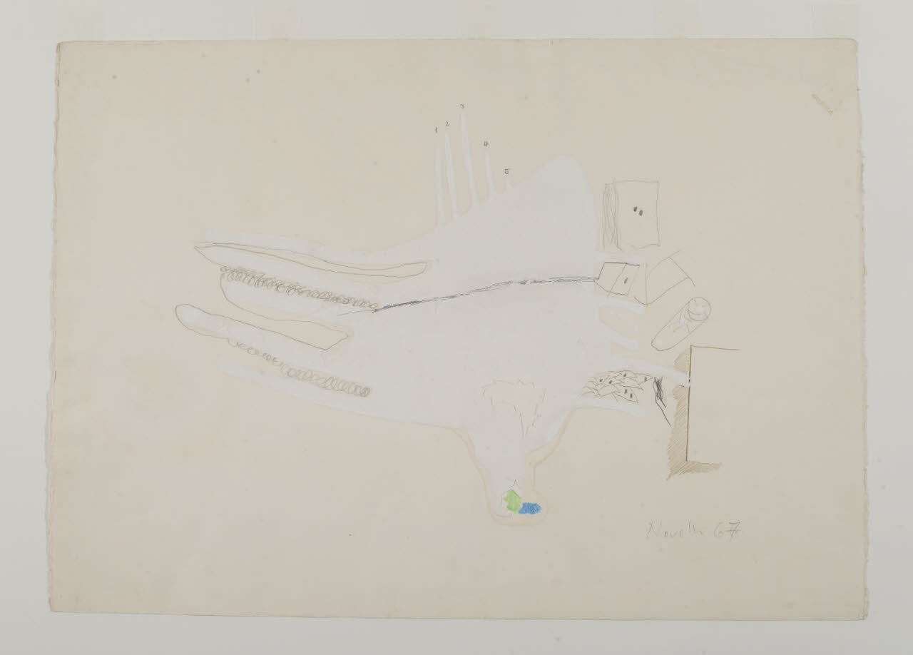 - NOTIZIE STORICO CRITICHE La produzione artistica di Gastone Novelli costituisce una delle ricerche espressive più rilevanti all’interno del panorama culturale italiano degli anni Cinquanta e Sessanta del secolo scorso. Esponente di punta della neoavanguardia, nonchè fondatore insieme ad Achille Perilli de "L’Esperienza Moderna" e de la "Grammatica" con Perilli, Giuliani e Manganelli (due delle riviste italiane più attente agli sviluppi della cultura contemporanea e alla "nuova figurazione"), Novelli elabora la sua opera come una nuova contrapposizione tra materia e gesto. Nelle sue pitture, così come nei suoi disegni, le forme e i segni sono carichi di vivacità espressiva e si concentrano verso nuove strutture semantiche di narrazione. Nel 1984 le civiche raccolte hanno acquistato da Giovanola Ripandelli, moglie dell’artista, otto opere su carta realizzate con tecnica mista. Queste ripercorrono la poetica creativa di Novelli all’interno di un periodo che va dal 1957 al 1968. Partendo da un atto informale, dove la creazione è concepita come energia di una nuova vita e superamento dell’antitesi tra figurativo e non figurativo, tali opere arrivano a un disegno che diventa scrittura, pensiero, concetto creativo. Se nei fogli della fine degli anni cinquanta (invv. 541, 542, 543) si osservano grumi materici di colore, grovigli di segni che affiorano latenti attreverso linee, nei fogli del decennio successivo (invv. 544, 545, 546, 547, 548) si assiste, invece, a un nuovo modo di lavorare, dove non è più possibile distinguere la scrittura dal disegno. \nIn alcuni fogli, ad esempio, (invv. 542, 543) spesse pennellate di colore diventano cancellature che lasciano affiorare simboli e macchie in trasparenza; in altri ancora (invv. 544, 545) il segno domina la composizione attraverso una scrittura automatica che diventa flusso di coscienza, il foglio bianco è diviso in settori ed è ricoperto da frasi e frammenti d’immagine. Infine, in altri (inv. 546, 548) la sagoma della montagna, con annotazioni e parole o quella della barca che galleggia in un mare di linee colorate, diventano simboli archetipi all’interno di un nuovo modo di comunicare . \nIl tratto del medium grafico con cui l’artista lavora è leggero, narrativo e sapiente; inoltre, come osservato da Massimo Bignardi, nelle sue opere grafiche "Gastone Novelli sottrae la linea al suo ruolo costruttivo, riducendo la presenza a mera traccia, corsiva e rapida apparizione, di minime annotazioni poste ai margini [...]. Il disegno diviene un processo d’immediato contatto, di facile fruire dell’immaginario e soprattutto delle energie sprigionate dagli stati profondi della psciche che vanno ad insinuarsi nei territori di fondi corposi, densamente plastici come avviene soprattutto nelle opere pittoriche" (M. Bignardi, l disegno dello "spregiato", in M. Perosino, Disegno italiano del Novecento, Milano 1993, p. 292). Un’antologia della sua opera su carta è stata curata da Flamionio Gualdoni al Padiglione d’Arte Contemporanea di Milano nel 1983, occasione nella quale furono esposti anche alcuni dei fogli sopra citati (invv. 544, 545, 548).