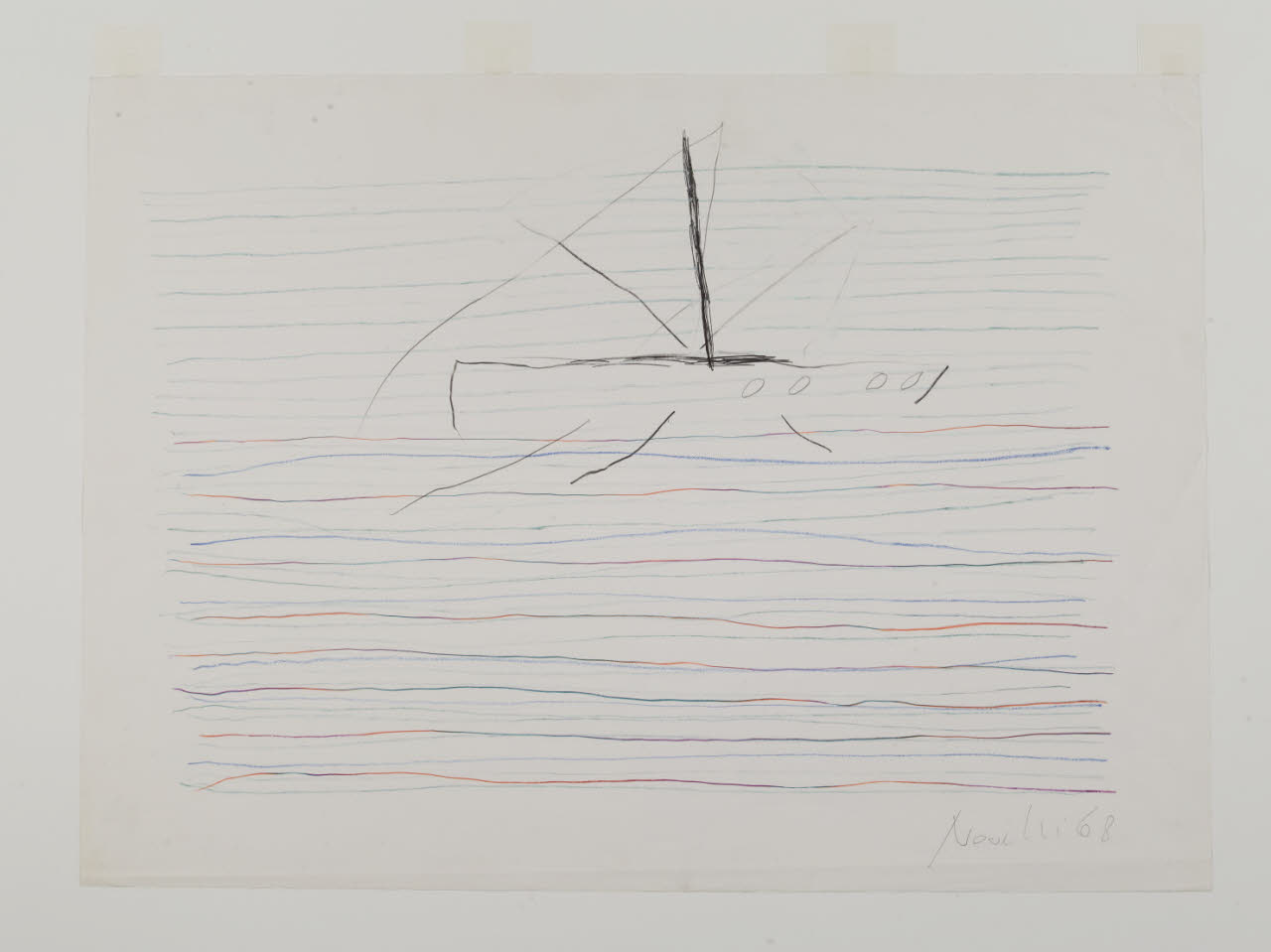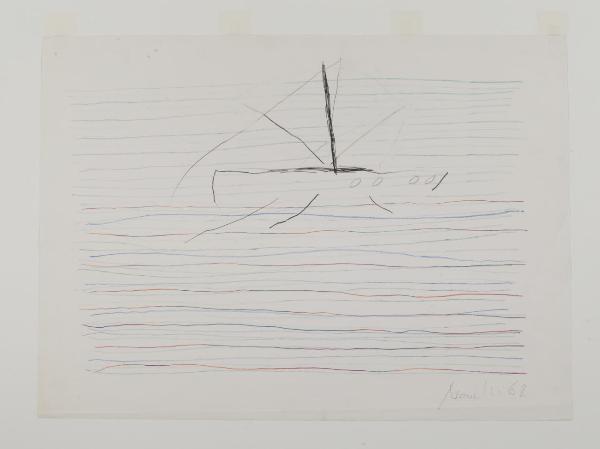 - NOTIZIE STORICO CRITICHE La produzione artistica di Gastone Novelli costituisce una delle ricerche espressive più rilevanti all’interno del panorama culturale italiano degli anni Cinquanta e Sessanta del secolo scorso. Esponente di punta della neoavanguardia, nonchè fondatore insieme ad Achille Perilli de "L’Esperienza Moderna" e de la "Grammatica" con Perilli, Giuliani e Manganelli (due delle riviste italiane più attente agli sviluppi della cultura contemporanea e alla "nuova figurazione"), Novelli elabora la sua opera come una nuova contrapposizione tra materia e gesto. Nelle sue pitture, così come nei suoi disegni, le forme e i segni sono carichi di vivacità espressiva e si concentrano verso nuove strutture semantiche di narrazione. Nel 1984 le civiche raccolte hanno acquistato da Giovanola Ripandelli, moglie dell’artista, otto opere su carta realizzate con tecnica mista. Queste ripercorrono la poetica creativa di Novelli all’interno di un periodo che va dal 1957 al 1968. Partendo da un atto informale, dove la creazione è concepita come energia di una nuova vita e superamento dell’antitesi tra figurativo e non figurativo, tali opere arrivano a un disegno che diventa scrittura, pensiero, concetto creativo. Se nei fogli della fine degli anni cinquanta (invv. 541, 542, 543) si osservano grumi materici di colore, grovigli di segni che affiorano latenti attreverso linee, nei fogli del decennio successivo (invv. 544, 545, 546, 547, 548) si assiste, invece, a un nuovo modo di lavorare, dove non è più possibile distinguere la scrittura dal disegno. \nIn alcuni fogli, ad esempio, (invv. 542, 543) spesse pennellate di colore diventano cancellature che lasciano affiorare simboli e macchie in trasparenza; in altri ancora (invv. 544, 545) il segno domina la composizione attraverso una scrittura automatica che diventa flusso di coscienza, il foglio bianco è diviso in settori ed è ricoperto da frasi e frammenti d’immagine. Infine, in altri (inv. 546, 548) la sagoma della montagna, con annotazioni e parole o quella della barca che galleggia in un mare di linee colorate, diventano simboli archetipi all’interno di un nuovo modo di comunicare . \nIl tratto del medium grafico con cui l’artista lavora è leggero, narrativo e sapiente; inoltre, come osservato da Massimo Bignardi, nelle sue opere grafiche "Gastone Novelli sottrae la linea al suo ruolo costruttivo, riducendo la presenza a mera traccia, corsiva e rapida apparizione, di minime annotazioni poste ai margini [...]. Il disegno diviene un processo d’immediato contatto, di facile fruire dell’immaginario e soprattutto delle energie sprigionate dagli stati profondi della psciche che vanno ad insinuarsi nei territori di fondi corposi, densamente plastici come avviene soprattutto nelle opere pittoriche" (M. Bignardi, l disegno dello "spregiato", in M. Perosino, Disegno italiano del Novecento, Milano 1993, p. 292). Un’antologia della sua opera su carta è stata curata da Flamionio Gualdoni al Padiglione d’Arte Contemporanea di Milano nel 1983, occasione nella quale furono esposti anche alcuni dei fogli sopra citati (invv. 544, 545, 548).