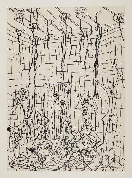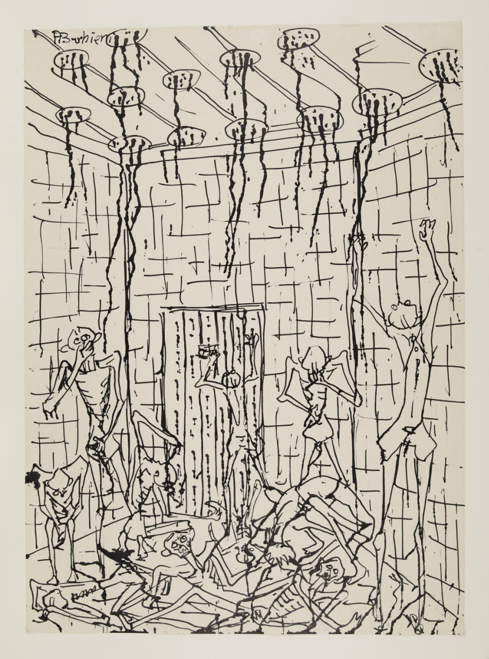 - NOTIZIE STORICO CRITICHE Agostino Barbieri intraprende l’attività artistica sin da giovanissimo. La chiamata alle armi, nel corso della Seconda Guerra Mondiale, lo porta in Jugoslavia come combattente nella campagna di Russia e dal 1943 è impegnato nella guerra di liberazione partigiana. Nel novembre del 1944, viene arrestato e deportato come prigioniero politico in un piccolo paese a pochi chilometri da Linz, nel campo di concentramento di Mauthausen. La tragica realtà a Mauthausen, oltre a lasciare un’impronta indelebile all’interno della sua esistenza, ha portato l’artista a creare alcune tra le più struggenti testimonianze grafiche sui campi di sterminio nazisti. All’interno delle raccolte del Civico Gabinetto di Disegni del Castello Sforzesco di Milano si conservano quindici disegni realizzati da Barbieri nel 1945, probabilmente subito dopo il suo ritorno in Italia (inv-inv. agg. 549-563). \nQueste opere sono caratterizzate da una forte concitazione espressiva mediata da una drastica semplificazione grafica della linea. Corpi nudi e senza vita sono ammassati su comuli di cadaveri, figure larvali dai volti smarriti sono posti all’interno di forni crematoi o in squallide baracche, lavorano nelle cave o all’interno del campo. In queste opere, il vigore della linea riesce a esprime e a comunicare aspetti di una realtà angosciante, un mondo dove ogni speranza è perduta e dove la sola certezza è la morte. Per l’incisività del tratto di china e la prorompente forza espressiva, tali opere possono considerarsi come una delle più toccanti testimonianze dell’agire umano; esse sono il ripensamento intellettuale di un ricordo indelebile, sono la denuncia alla più mostruosa macchina di annientamento verso l’essere umano. Forte è inoltre il legame tra questi disegni e le opere dell’espressionismo tedesco, dove la presenza di figure spettrali diventa l’elemento principale di una pantomima sociale: nei disegni di Barbieri, però, tali elementi diventano fantasmi ridotti al degrado più assoluto, sono corpi che simulano l’esistenza attraverso una terribile danza macabra