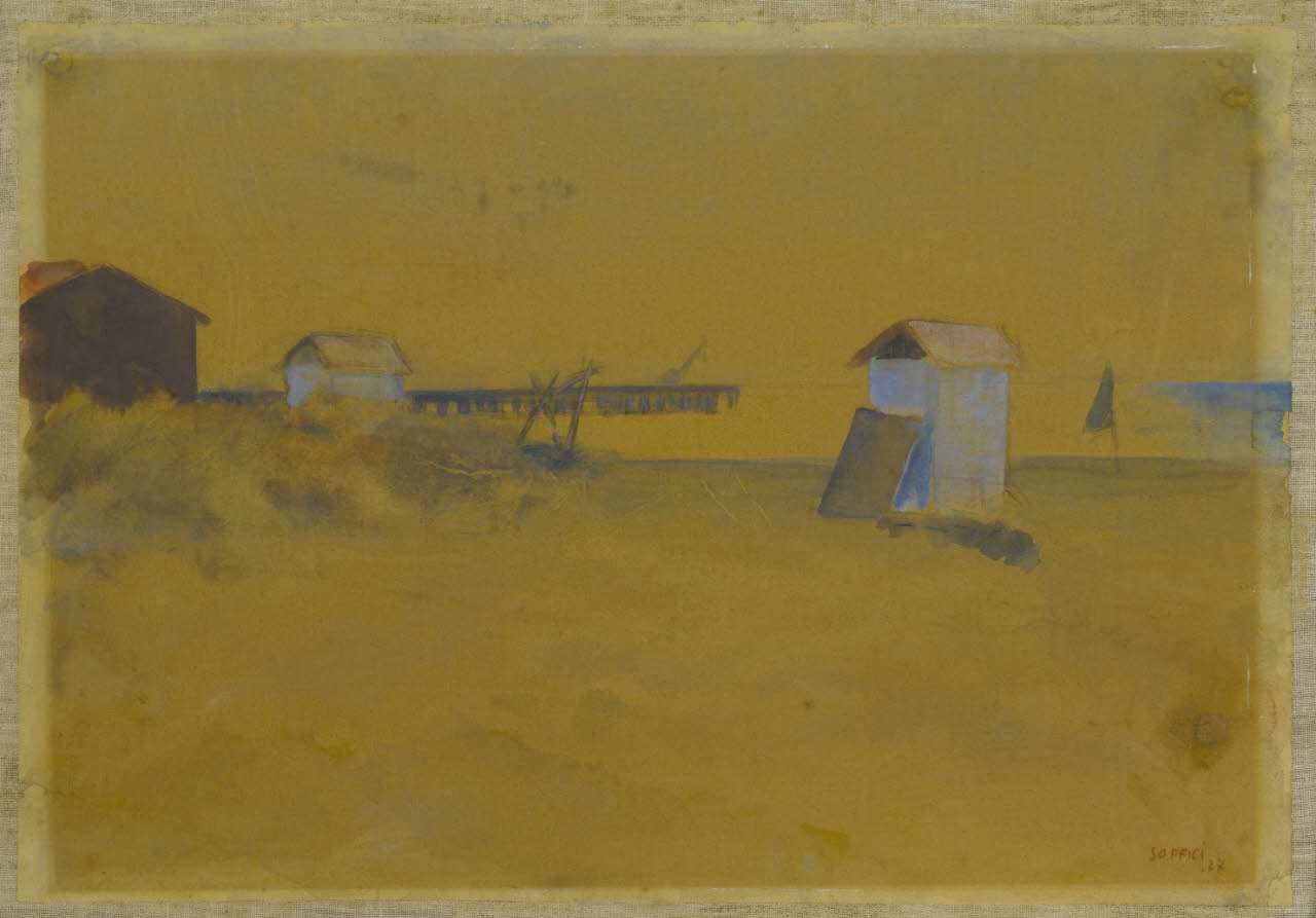 - NOTIZIE STORICO CRITICHE Intorno alla metà degli anni Venti lo sviluppo dell'opera di Soffici si avvia verso una nuova visione dell'arte. Avvicinatosi sempre di più alle poetiche del Novecento, l'artista toscano inizia a soffermarsi sul paesaggio e su un attento studio della natura. Dal 1926, oltre alle numerose vedute di Poggio a Caiano, in cui descrive la campagne toscana, figurano tra le sue opere anche le spiagge della Versilia e in particolare quella di Forte dei Marmi, dove nelle calde estati si ritrovava con pittori, letterati e critici. Nella Versilia l'artista trovò un'alterativa tematica ed espressiva al panorama della propria regione; realizza in questo contesto numerose opere di paesaggi marini, spiagge e cabine in riva al mare. Un esempio è il disegno custodito oggi presso le raccolte grafiche del Gabinetto di Disegni del Castello Sforzesco, esposto nel 1929 all'interno della Seconda Mostra del Novecento Italiano, insieme ad altri due acquerelli aventi il medesimo soggetto. Il disegno, acquistato in quella stessa occasione, può essere messo in relazione alle numerose opere a olio del periodo come "Cabine" ("Spiaggia; cabina a Forte dei Marmi") del 1927 e soprattutto al dipinto "Ponte caricatore a Forte dei Marmi" ("Vento sul mare") in cui si riconosce lo stesso pontile visibile nel foglio del Castello. Quest'ultimo è attraversato da una tenue tinteggiatura della carta, ottenuta mediante impalpabili pennellate azzurre che insieme ai pallidi e acerbi colori del disegno accentuano nell'opera l'atmosfera di solitudine, amplificata dall'assenza di elementi umani. La presenza dell'uomo, infatti, è suggerita solo indirettamente da una piccola barca in mare e da tre cabine adagiate su di un paesaggio di sabbia.\nNel catalogo della Seconda Mostra del Novecento italiano, a p. 24, sono elencate tre opere con lo stesso soggetto ("Marina") e tecnica: non è pertanto possibile stabilire a quale delle tre corrisponda quella qui catalogata.