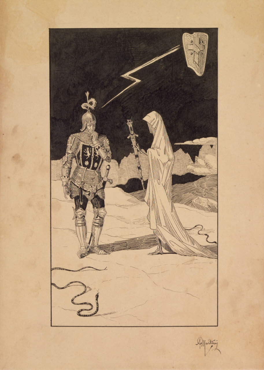 - NOTIZIE STORICO CRITICHE Come ricordato da Mercedes Garberi fu grazie alla segnalazione di Emilio Bertonati che, nel 1981, le collezioni civiche del Castello Sforzesco ottennero, grazie a un acquisto presso la Galleria del Levante, i quattordici disegni a inchiostro di china e acquerello eseguiti da Alberto Martini intorno 1895, raffiguranti L'albo della morte, opere apripista della "accesa serie dei cicli senza legami con le fonti letterarie" (Garberi 1981). Questo ciclo giovanile, così come quello dei primi disegni della serie dedicata a La secchia rapita di Tassoni, dette inizio alla copiosa produzione di incisioni e illustrazioni realizzate dell'artista negli anni successivi, che ne fecero uno tra gli illustratori italiani maggiormente apprezzati in Italia e in Europa (Ivi). La serie dell'Albo della morte, appartenuta inizialmente alla vedova dell'artista Maria Petringa, venne trasferita agli eredi, e in seguito alla Galleria del Levante di Milano che li espose per la prima volta in una mostra dedicata all'autore tra il 1978 e il 1979. Nei quattordici disegni è già rintracciabile un forte legame di Martini con la cultura decadente del suo tempo a cui si associano suggestioni cinquecentesche derivanti dalla grafica di Dürer, di Luca di Leida, Graf e Grien oltre che da significativi rimandi al simbolismo nordico moderno franco-belga e tedesco. Il frontespizio, così come l'intera serie, è caratterizzato da una grafica neo-gotica che si apre con l'invocazione oraziana Pallida mors aequo pulsat pede pauperum tabernas regumque turres, anticipando verbalmente quanto raffigurato nei fogli, in cui con fermezza si assiste alla rappresentazione della morte nella sua veste più scabrosa. Chiaro nell'intero ciclo è il rimando alle donne angeliche di Previati o ad alcune opere segantiniane come "Cattive madri" o "L'angelo della vita", in cui l'eleganza delle figure femminili si scontra con la staticità della morte che rievoca, invece, i soggetti e le ambientazioni macabre di molte delle opere dell'artista belga Félicien Rops e dei tedeschi Max Klinger e Joseph Sattler.