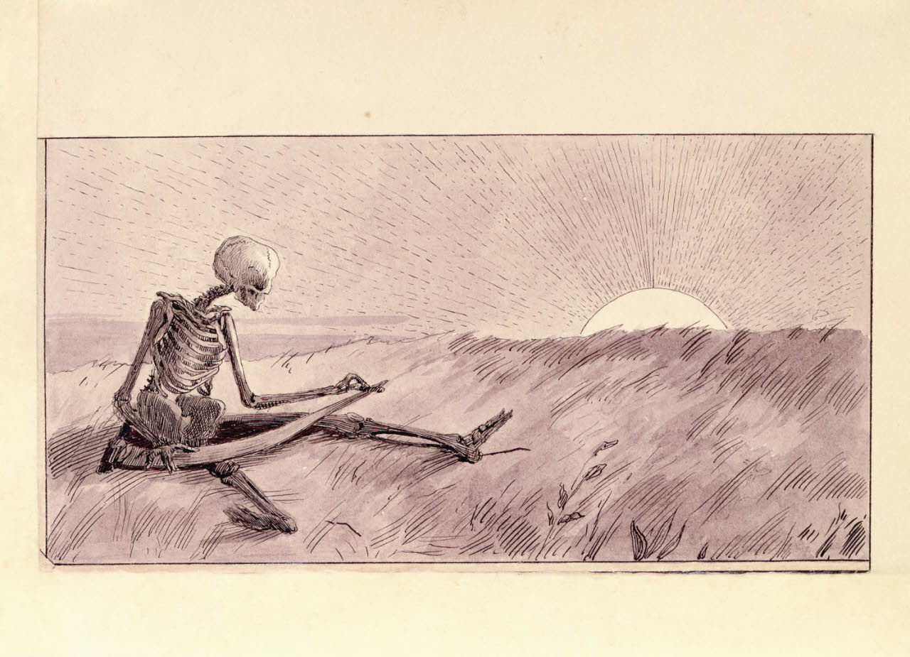 - NOTIZIE STORICO CRITICHE Come ricordato da Mercedes Garberi fu grazie alla segnalazione di Emilio Bertonati che, nel 1981, le collezioni civiche del Castello Sforzesco ottennero, grazie a un acquisto presso la Galleria del Levante, i quattordici disegni a inchiostro di china e acquerello eseguiti da Alberto Martini intorno 1895, raffiguranti L'albo della morte, opere apripista della "accesa serie dei cicli senza legami con le fonti letterarie" (Garberi 1981). Questo ciclo giovanile, così come quello dei primi disegni della serie dedicata a La secchia rapita di Tassoni, dette inizio alla copiosa produzione di incisioni e illustrazioni realizzate dell'artista negli anni successivi, che ne fecero uno tra gli illustratori italiani maggiormente apprezzati in Italia e in Europa (Ivi). La serie dell'Albo della morte, appartenuta inizialmente alla vedova dell'artista Maria Petringa, venne trasferita agli eredi, e in seguito alla Galleria del Levante di Milano che li espose per la prima volta in una mostra dedicata all'autore tra il 1978 e il 1979. Nei quattordici disegni è già rintracciabile un forte legame di Martini con la cultura decadente del suo tempo a cui si associano suggestioni cinquecentesche derivanti dalla grafica di Dürer, di Luca di Leida, Graf e Grien oltre che da significativi rimandi al simbolismo nordico moderno franco-belga e tedesco. Il frontespizio, così come l'intera serie, è caratterizzato da una grafica neo-gotica che si apre con l'invocazione oraziana Pallida mors aequo pulsat pede pauperum tabernas regumque turres, anticipando verbalmente quanto raffigurato nei fogli, in cui con fermezza si assiste alla rappresentazione della morte nella sua veste più scabrosa. Chiaro nell'intero ciclo è il rimando alle donne angeliche di Previati o ad alcune opere segantiniane come "Cattive madri" o "L'angelo della vita", in cui l'eleganza delle figure femminili si scontra con la staticità della morte che rievoca, invece, i soggetti e le ambientazioni macabre di molte delle opere dell'artista belga Félicien Rops e dei tedeschi Max Klinger e Joseph Sattler.
