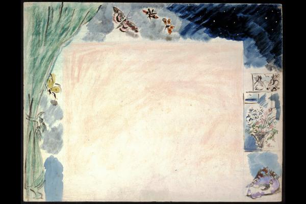 - NOTIZIE STORICO CRITICHE Il disegno fa parte di una serie di bozzetti realizzati dall'artista ferrarese in occasione della messa in scena dell'opera da camera di Vittorio Rieti "Teresa nel bosco", proposta per la prima volta nel settembre del 1934, durante il Terzo Festival Internazionale di Musica a Venezia, all'interno del teatro Goldoni. \nCon l'idea di far rivivere in forme attuali quella che è la tradizione italiana dell'intermezzo sei- settecentesco, lo spettacolo prevedeva tre opere brevi in un atto: "Teresa nel bosco" di Vittorio Rieti, "Una Favola di Anderson" di Antonio Veretti e "Cefalo e Procri" dell'austriaco Krenek con scenografie e costumi curati rispettivamente da De Pisis, Oppo e Bragaglia. \nLeggendo tra pagine di "Emporium", dove è raccontato l'evento, si evince però che il lavoro di Rieti non ebbe il successo sperato: "di Rieti noteremo soltanto la infantile puerilità dell'idea e la scarsa e ambigua inventiva adoperata per esprimerla" (Gavazzeni 1934). Dell'opera non era stata apprezzata quella combinazione tra verismo e introspezione romantica con cui veniva descritta la storia di Teresa, una donna stanca della propria vita coniugale e della mediocrità del marito; alle prese con l'alcol e i giochi di due figli capricciosi, che decide alla fine di scappare nel bosco vivendo con gli animali, fin quando un guardia caccia non la convince a tornare a casa. "Esito fu quantomai burrasco; canzonature e risate da parte della maggioranza del pubblico; qualche applauso degli amici alla fine" (Ivi). Al contrario però le scenografie di De Pisis furono apprezzate, grazie all'impressione suscitata dalla compostezza degli ambienti e dall'armonia dei colori delle scene (Pontiggia 1985). I diciotto bozzetti da datare tra il 1933 e 1934 sono oggi conservati presso il Gabinetto di Disegni del Castello Sforzesco e fecero parte della collezione di Letizia Pecci-Blunt; solo nel 1985 furono donati alle raccolte pubbliche da Gabrielli Nazareno. \nIn esse De Pisis, lontano dalle congetture architettoniche, dinamiche e luministiche vicine al futurismo, si affida prevalentemente al fondale dipinto mediante uno statico sfondo cromatico senza prospettiva che riproduce l'interno di una casa dal mobilio semplice; l'ambiente rappresentato si caratterizza per la sua sobrietà e una studiata simmetria (invv. 599, 600, 602). \nIl fondale realizzato per la scena notturna nel bosco assume connotati evanescenti (inv. 601). Qui, per eludere la lontananza prospettica De Pisis pone una serie di alberi allineati e resi attraverso pennellate guizzanti e rapidi tocchi allusivi di colore, intessuto tramite brandelli di azzurro. Le stesse pennellate sono utilizzate nei piccoli fogli da schizzo della serie dei cervi (invv. 592-594) o nei fogli più grandi, sempre con le stesse figure (invv. 586-587) le quali acquistano una sottile dimensione visionaria. \nLo stesso stile pittorico caratterizza i bozzetti realizzati per lo studio dei personaggi (Studio del servo Francesco - inv. 588; Papà Teodoro - inv. 589; Guardaboschi Luigi - inv. 590; Anna e Gianni bambini - invv. 598, 597), dove accanto a piccole pennellate di vivaci colori, sono affiancate annotazioni a matita con le caratteristiche degli indumenti e degli oggetti da indossare: guanti bianchi e scarpe nere per il figurino del Fauno del Bosco (inv. 595); sciarpa rossa con tunichetta bianca e collana di corallo per Anna o strisce azzurre nella maglia di Gianni; mentre per lo "Studio di moda per l'abito di Teresa" De Pisis crea un collage ritagliando semplicemente una rivista del periodo, da dove ricava un figurino che colora di giallo (inv. 596). Per incorniciare il tutto l'artista aveva pensato a un sipario popolato da suggestioni e simboli poetici: uno sciame di farfalle che vola verso la notte stellata. Si crea così un legame evocativo tra spettacolo e spettatore attraverso quella delicatezza degli accostamenti cromatici in una composizione fatta di semplicità e simmetria (Pontiggia 1985). Un'esperienza, quella di scenografo, che porterà De Pisis a nuove sperimentazioni; negli anni Quaranta seguiranno, infatti, gli allestimenti per "Bastiano e Bastiana" di Mozart (nel 1941 al Teatro delle Arti di Roma), il balletto per "La rosa del sogno" di Millos-Casella (all'Opera di Roma nel 1943) e infine i soli costumi per gli "Etudes Synphoniques" di Kniaseff-Shuman del 1948 (per il Ballet de Pasis) (Monti 1985).
