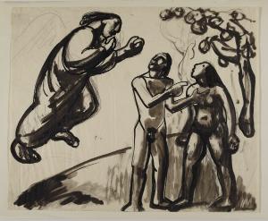 - NOTIZIE STORICO CRITICHE L'11 aprile del 1932 all'interno della Galleria del Milione si inaugura una mostra personale di Elena Maria Boglino, artista di origine danese che da diversi anni aveva scelto la città di Palermo come luogo d'adozione in cui vivere e lavorare. La mostra organizzata da Baldi, dopo l'esclusione della Boglino dalla I Quadriennale di Roma, viene presentata con una monografia sull'artista curata dallo stesso critico ed edita da Vallecchi. L'8 luglio dello stesso anno le raccolte pubbliche milanesi registrano l'acquisto di due disegni dell'artista: "Studio di due nudi femminili" (inv. 870 D 42) e "Apparizione di Dio Padre ad Adamo ed Eva" (sulla monografia illustrato e indicato con il titolo di Adamo ed Eva). In quest'ultima opera, l'artista descrive sinteticamente la scena della genesi attraverso una figurazione che si avvicina ai bassorilievi dei portali romanici. Il disegno è delineato da grosse pennellate d'inchiostro di china che, oltre a definire le forme delle figure, evidenziano le ombre attraverso spesse velature d'inchiostro acquerellato. A matita sono descritti alcuni particolari che non vengono nascosti dal colore, come le ali di Dio Padre, il tronco dell'albero e il serpente che in esso si attorciglia. L'opera nel suo complesso è descritta attraverso un forte carattere narrativo che, grazie al gioco di sguardi dei protagonisti, allontana la raffigurazione da quell'aspetto drammatico generalmente presente in questa iconografica (Vilardi 2001-2002).
