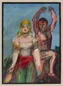 - NOTIZIE STORICO CRITICHE All'interno della Libreria del Milione, dal 22 marzo 1931 Leonardo Borgese espone un gruppo di disegni caratterizzati da un vivace senso di rievocazione fantastica. In quell'occasione le raccolte pubbliche acquistano del pittore un foglio intitolato "Donna velata e uomo folleggiante" insieme a due opere di Melerba (Vilardi 2001-2002). Nel coloratissimo foglio di Borgese, riquadrato da una cornice di colore nero, sono descritti due personaggi: una dolce fanciulla in posa statica e un satiro che danza alle sue spalle, il quale offre alla composizione un senso di dinamicità. Lo sfondo blu, che ricopre lo spazio del cielo, si contrappone agli accesi colori vibranti presenti sul resto della scena, creati con veloci pennellate capaci di donare all'immagine una vigorosa eleganza.