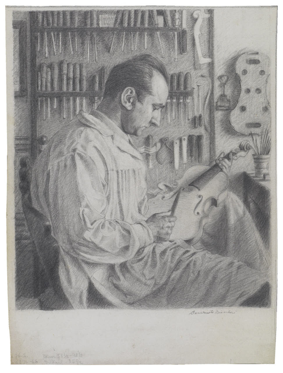 - NOTIZIE STORICO CRITICHE Benvenuto Disertori, estraneo alle avanguardie del suo tempo, ha sviluppato nelle sue opere uno stile sensibile e raffinato. Assimilata la cultura Liberty e decadentista del periodo, l’artista si è distinto in modo particolare nel disegno e nell’incisione affermandosi, inoltre, come illustratore per dell’editoria e come musicologo. \nQuesto disegno fa parte di un gruppo di quattordici disegni che nel febbraio 2015 sono stati donati al Gabinetto di Disegni del Castello Sforzesco di Milano, dal figlio Andrea (invv-invv. Agg. 1109 -1122).\nQuesto studio, in particolare, è stato realizzato come bozzetto preparatorio per una litografia e fa parte di una serie di studi a disegno e stampe raffiguranti i tre fratelli Carlo, Giacomo e Leandro Junior (P. Bellini, A. Alberti, "Benvenuto Disertori. Catalogo ragionato dell'opera grafica e degli ex libris", Milano 2000, p. 80 n. 67). Questi, insieme al padre, furono una famiglia molto apprezzata di liutai operanti a Milano, con cui Disertori ebbe modo di studiare la struttura degli strumenti musicali a corda, antichi e moderni.\nGiacomo è ritratto di profilo con la testa china verso il basso, intento a fabbricare un violino all’interno della sua bottega. Il disegno, eseguito a matita, descrive attraverso un’attenta e dettagliata analisi il personaggio, magistralmente chiaroscurato. Il panneggio, i particolari della stanza e gli strumenti di lavoro, addossati alla parete retrostante, mostrano la grande maestria dell’artista nell’utilizzo del mezzo grafico. Il naturalistico chiaroscuro, inoltre, risulta intenso con una forte valenza naturalistica.