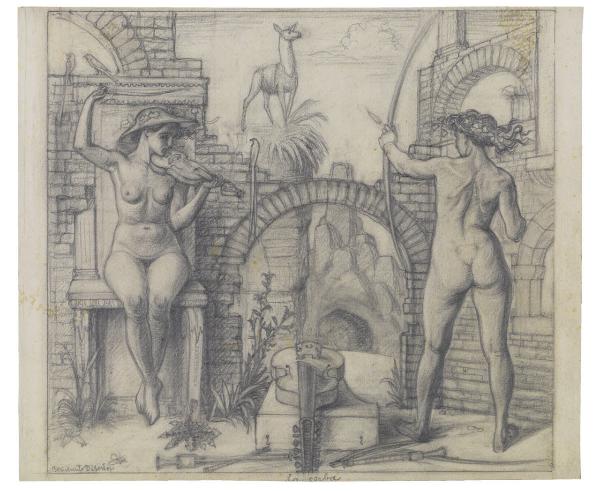 - NOTIZIE STORICO CRITICHE Nel 1950 Benvenuto Disertori ha presentato alla Biennale di Venezia un disegno dal titolo La cerba, datato 1944, raffigurante una scena dal contenuto enigmatico ambientata tra le rovine di una dimora, ispirata ad un verso dell'omonimo poema di Cecco d'Ascoli "La cerba en melodia se delecta, Si ch'una chacciatrice suona et chanta, et l'altra acerbamente la sajecta". Protagoniste della scena sono tre figure femminili nude: a destra una che sta per lanciare una freccia ad una cerva, a sinistra una seduta mentre suona il violino, infine l'ultima è distesa in primo piano. Il disegno fa oggi parte del Fondo Disertori al Gabinetto dei Disegni del Castello Sforzesco (inv. FD D 478; per un approfondimento cfr. G. Ricagni, La Cerba: l'enigma di un'allegoria, in "Grafica d'arte", 2003, pp. 30-32). Nella stessa collezione si conservano diversi studi per la composizione nel suo insieme oppure studi di figura. In stretta relazione con il soggetto di questo disegno sono due incisioni, entrambe rarissime e apparentemente non terminate (inv. FD S 10, Bellini-Alberti 53; FD S 17, Bellini-Alberti 57). Il legame tra tutte le opere riferibili in qualche modo al progetto La cerba non risulta, allo stato degli studi, adeguatamente documentato per le oggettive difficoltà a visionare, quando si trovavano nella collezione di Andrea Disertori, l'intera sequenza dei materiali. Non è da escludere che tutto fosse finalizzato alla realizzazione di un'incisione, di cui le due piccole lastre avrebbero potuto costituire un primo tentativo di traduzione sul rame. Per questa ragione, a questo primo livello di catalogazione, si propone per tutto il nucleo La cerba una datazione verso il 1944.