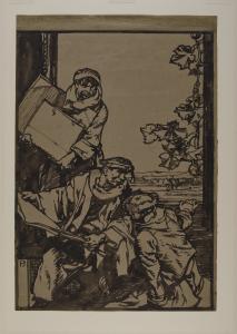 - NOTIZIE STORICO CRITICHE Frank Brangwyn, pittore e incisore inglese di figure, paesaggi e vedute, si formò all'interno dello studio di William Morris dove realizzò bozzetti per arazzi e per diversi lavori d'arte applicata. Attivo in tutti i campi dell'arte, dipinse pannelli e decorazioni ed eseguì disegni per vetrate e mobili, illustrazioni e manifesti, acqueforti e litografie. Prese parte alla Biennale di Venezia già dai primi anni della manifestazione ed espose alla mostra Di Bianco e Nero a Roma nel 1902 e all'Esposizione d'Arte decorativa a Milano del 1906 (Contò, Rossi 2016). Grazie a queste esperienze, in Italia si fece apprezzare da un ampio pubblico e dalla critica, in particolar modo da Vittorio Pica che, oltre a dedicargli uno dei primi saggi critici sulla sua attività, ne collezionò diverse opere. Proprio al critico d'arte apparteneva il disegno "Artisti", pubblicato dallo stesso come frontespizio (riprodotto in colore rosso) del saggio "Due maestri nordici dell'incisione: Anders Zorn e Frank Brangwyn", all'interno della rubrica "Attraverso gli albi e le cartelle". Nel 1931 il disegno venne acquistato durante l'asta delle collezioni di pitture, sculture e disegni di Vittorio Pica presso la Galleria Casa d'Artisti, ed è oggi conservato presso il Gabinetto di Disegni di Milano. Nel foglio in questione, eseguito a pennello e a inchiostro bruno più o meno diluito su carta azzurra, è visibile il sobrio stile pittorico orientalizzante e la magistrale eccellenza tecnica dell'artista britannico, oltre che l'individuale visione evocativa della rappresentazione a carattere teatrale.