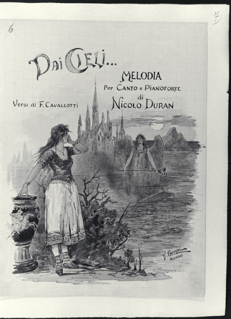 - NOTIZIE STORICO CRITICHE L’album inv. L B 15 del Civico Gabinetto dei Disegni del Castello Sforzesco, raccoglie una serie di illustrazioni realizzate da Giacomo Campi (1846 - 1921). Donato al Comune di Milano da Luigi Donnini nel 1937, è composto da 61 fogli montati su 63 pagine di carta color avorio dove su ognuna di esse è indicato a matita il corrispettivo numero progressivo dei diversi fogli. I disegni, tutti firmati"Giacomo Campi. Milano", sono stati realizzati come frontespizi di spettacoli musicali, canzoni e ballate composte da Nicolò Duran; i versi di alcune di queste composizioni sono invece di U. Barbieri, E. Boccola, F. Cavallotti, G. E. Ducati, G. Giacchi, R. Paravicini, L. Stecchetti, Q. Vivanti, J. Well. Tali opere grafiche, molte delle quali quadrettate a matita, sono realizzate con rapidi e veloci tratti di inchiostro nero e acquerelli colorati dalle vivaci e cangianti cromie. Su ogni foglio, nella parte superiore al centro, campeggia il titolo della composizione descritta con caratteri stilizzati, arabeschi vegetali e capilettera figurali. Le scene rappresentate hanno spesso ambientazioni che evocano il genere musicale e rimandano a un tipico gusto Liberty, che si trasforma in motivi rococò o neoclassici. Nelle diverse composizioni si osservano principalmente soggetti e figure di giovani innamorati che danzano, si guardano o assumono atteggiamenti e pose romantiche in ambienti bucolici o all’interno di ricche dimore. Difficile risulta, a oggi, stabilire una data certa per la loro esecuzione, ma è molto probabile che siano state realizzate in un lasso di tempo abbastanza ampio e verosimilmente dopo il 1871, anno in cui l’artista prese fissa dimora a Milano. Il pittore, prima di tale data, aveva infatti frequentato l’Accademia Carrara di Bergamo e successivamente l’Accademia di S. Luca a Roma. Nella Milano di fine Ottocento acquistò subito grande popolarità, prese attivamente parte a tutte le manifestazioni della "Scapigliatura" lombarda e si distinse come pittore di affreschi, scene di genere e acquafortista, oltre che come inconfondibile acquerellista.