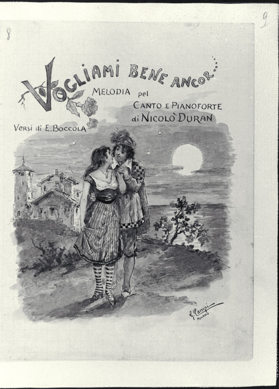 - NOTIZIE STORICO CRITICHE L’album inv. L B 15 del Civico Gabinetto dei Disegni del Castello Sforzesco, raccoglie una serie di illustrazioni realizzate da Giacomo Campi (1846 - 1921). Donato al Comune di Milano da Luigi Donnini nel 1937, è composto da 61 fogli montati su 63 pagine di carta color avorio dove su ognuna di esse è indicato a matita il corrispettivo numero progressivo dei diversi fogli. I disegni, tutti firmati"Giacomo Campi. Milano", sono stati realizzati come frontespizi di spettacoli musicali, canzoni e ballate composte da Nicolò Duran; i versi di alcune di queste composizioni sono invece di U. Barbieri, E. Boccola, F. Cavallotti, G. E. Ducati, G. Giacchi, R. Paravicini, L. Stecchetti, Q. Vivanti, J. Well. Tali opere grafiche, molte delle quali quadrettate a matita, sono realizzate con rapidi e veloci tratti di inchiostro nero e acquerelli colorati dalle vivaci e cangianti cromie. Su ogni foglio, nella parte superiore al centro, campeggia il titolo della composizione descritta con caratteri stilizzati, arabeschi vegetali e capilettera figurali. Le scene rappresentate hanno spesso ambientazioni che evocano il genere musicale e rimandano a un tipico gusto Liberty, che si trasforma in motivi rococò o neoclassici. Nelle diverse composizioni si osservano principalmente soggetti e figure di giovani innamorati che danzano, si guardano o assumono atteggiamenti e pose romantiche in ambienti bucolici o all’interno di ricche dimore. Difficile risulta, a oggi, stabilire una data certa per la loro esecuzione, ma è molto probabile che siano state realizzate in un lasso di tempo abbastanza ampio e verosimilmente dopo il 1871, anno in cui l’artista prese fissa dimora a Milano. Il pittore, prima di tale data, aveva infatti frequentato l’Accademia Carrara di Bergamo e successivamente l’Accademia di S. Luca a Roma. Nella Milano di fine Ottocento acquistò subito grande popolarità, prese attivamente parte a tutte le manifestazioni della "Scapigliatura" lombarda e si distinse come pittore di affreschi, scene di genere e acquafortista, oltre che come inconfondibile acquerellista.