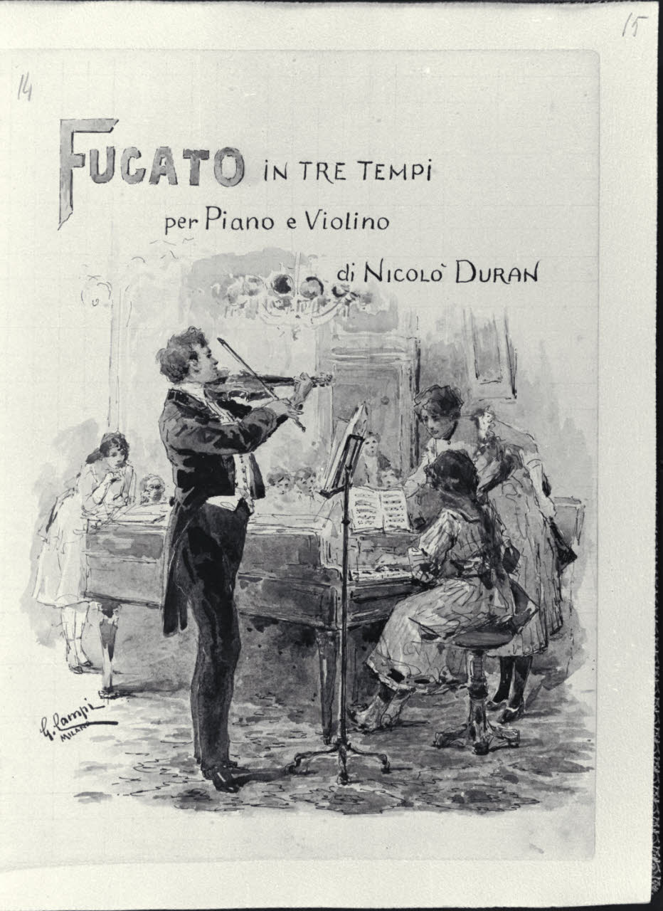 - NOTIZIE STORICO CRITICHE L’album inv. L B 15 del Civico Gabinetto dei Disegni del Castello Sforzesco, raccoglie una serie di illustrazioni realizzate da Giacomo Campi (1846 - 1921). Donato al Comune di Milano da Luigi Donnini nel 1937, è composto da 61 fogli montati su 63 pagine di carta color avorio dove su ognuna di esse è indicato a matita il corrispettivo numero progressivo dei diversi fogli. I disegni, tutti firmati"Giacomo Campi. Milano", sono stati realizzati come frontespizi di spettacoli musicali, canzoni e ballate composte da Nicolò Duran; i versi di alcune di queste composizioni sono invece di U. Barbieri, E. Boccola, F. Cavallotti, G. E. Ducati, G. Giacchi, R. Paravicini, L. Stecchetti, Q. Vivanti, J. Well. Tali opere grafiche, molte delle quali quadrettate a matita, sono realizzate con rapidi e veloci tratti di inchiostro nero e acquerelli colorati dalle vivaci e cangianti cromie. Su ogni foglio, nella parte superiore al centro, campeggia il titolo della composizione descritta con caratteri stilizzati, arabeschi vegetali e capilettera figurali. Le scene rappresentate hanno spesso ambientazioni che evocano il genere musicale e rimandano a un tipico gusto Liberty, che si trasforma in motivi rococò o neoclassici. Nelle diverse composizioni si osservano principalmente soggetti e figure di giovani innamorati che danzano, si guardano o assumono atteggiamenti e pose romantiche in ambienti bucolici o all’interno di ricche dimore. Difficile risulta, a oggi, stabilire una data certa per la loro esecuzione, ma è molto probabile che siano state realizzate in un lasso di tempo abbastanza ampio e verosimilmente dopo il 1871, anno in cui l’artista prese fissa dimora a Milano. Il pittore, prima di tale data, aveva infatti frequentato l’Accademia Carrara di Bergamo e successivamente l’Accademia di S. Luca a Roma. Nella Milano di fine Ottocento acquistò subito grande popolarità, prese attivamente parte a tutte le manifestazioni della "Scapigliatura" lombarda e si distinse come pittore di affreschi, scene di genere e acquafortista, oltre che come inconfondibile acquerellista.