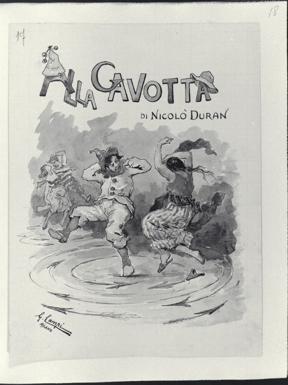 - NOTIZIE STORICO CRITICHE L’album inv. L B 15 del Civico Gabinetto dei Disegni del Castello Sforzesco, raccoglie una serie di illustrazioni realizzate da Giacomo Campi (1846 - 1921). Donato al Comune di Milano da Luigi Donnini nel 1937, è composto da 61 fogli montati su 63 pagine di carta color avorio dove su ognuna di esse è indicato a matita il corrispettivo numero progressivo dei diversi fogli. I disegni, tutti firmati"Giacomo Campi. Milano", sono stati realizzati come frontespizi di spettacoli musicali, canzoni e ballate composte da Nicolò Duran; i versi di alcune di queste composizioni sono invece di U. Barbieri, E. Boccola, F. Cavallotti, G. E. Ducati, G. Giacchi, R. Paravicini, L. Stecchetti, Q. Vivanti, J. Well. Tali opere grafiche, molte delle quali quadrettate a matita, sono realizzate con rapidi e veloci tratti di inchiostro nero e acquerelli colorati dalle vivaci e cangianti cromie. Su ogni foglio, nella parte superiore al centro, campeggia il titolo della composizione descritta con caratteri stilizzati, arabeschi vegetali e capilettera figurali. Le scene rappresentate hanno spesso ambientazioni che evocano il genere musicale e rimandano a un tipico gusto Liberty, che si trasforma in motivi rococò o neoclassici. Nelle diverse composizioni si osservano principalmente soggetti e figure di giovani innamorati che danzano, si guardano o assumono atteggiamenti e pose romantiche in ambienti bucolici o all’interno di ricche dimore. Difficile risulta, a oggi, stabilire una data certa per la loro esecuzione, ma è molto probabile che siano state realizzate in un lasso di tempo abbastanza ampio e verosimilmente dopo il 1871, anno in cui l’artista prese fissa dimora a Milano. Il pittore, prima di tale data, aveva infatti frequentato l’Accademia Carrara di Bergamo e successivamente l’Accademia di S. Luca a Roma. Nella Milano di fine Ottocento acquistò subito grande popolarità, prese attivamente parte a tutte le manifestazioni della "Scapigliatura" lombarda e si distinse come pittore di affreschi, scene di genere e acquafortista, oltre che come inconfondibile acquerellista.