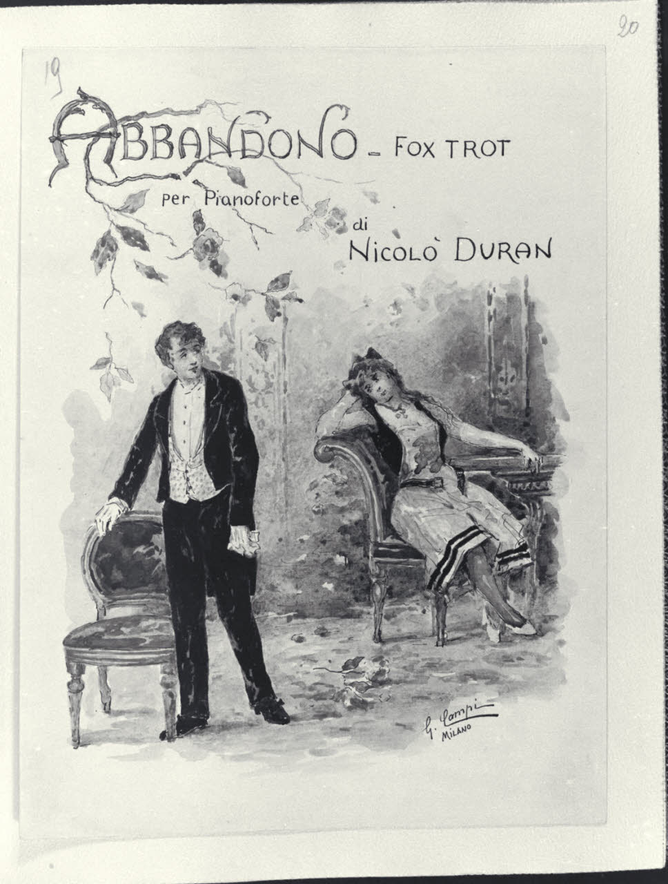 - NOTIZIE STORICO CRITICHE L’album inv. L B 15 del Civico Gabinetto dei Disegni del Castello Sforzesco, raccoglie una serie di illustrazioni realizzate da Giacomo Campi (1846 - 1921). Donato al Comune di Milano da Luigi Donnini nel 1937, è composto da 61 fogli montati su 63 pagine di carta color avorio dove su ognuna di esse è indicato a matita il corrispettivo numero progressivo dei diversi fogli. I disegni, tutti firmati"Giacomo Campi. Milano", sono stati realizzati come frontespizi di spettacoli musicali, canzoni e ballate composte da Nicolò Duran; i versi di alcune di queste composizioni sono invece di U. Barbieri, E. Boccola, F. Cavallotti, G. E. Ducati, G. Giacchi, R. Paravicini, L. Stecchetti, Q. Vivanti, J. Well. Tali opere grafiche, molte delle quali quadrettate a matita, sono realizzate con rapidi e veloci tratti di inchiostro nero e acquerelli colorati dalle vivaci e cangianti cromie. Su ogni foglio, nella parte superiore al centro, campeggia il titolo della composizione descritta con caratteri stilizzati, arabeschi vegetali e capilettera figurali. Le scene rappresentate hanno spesso ambientazioni che evocano il genere musicale e rimandano a un tipico gusto Liberty, che si trasforma in motivi rococò o neoclassici. Nelle diverse composizioni si osservano principalmente soggetti e figure di giovani innamorati che danzano, si guardano o assumono atteggiamenti e pose romantiche in ambienti bucolici o all’interno di ricche dimore. Difficile risulta, a oggi, stabilire una data certa per la loro esecuzione, ma è molto probabile che siano state realizzate in un lasso di tempo abbastanza ampio e verosimilmente dopo il 1871, anno in cui l’artista prese fissa dimora a Milano. Il pittore, prima di tale data, aveva infatti frequentato l’Accademia Carrara di Bergamo e successivamente l’Accademia di S. Luca a Roma. Nella Milano di fine Ottocento acquistò subito grande popolarità, prese attivamente parte a tutte le manifestazioni della "Scapigliatura" lombarda e si distinse come pittore di affreschi, scene di genere e acquafortista, oltre che come inconfondibile acquerellista.