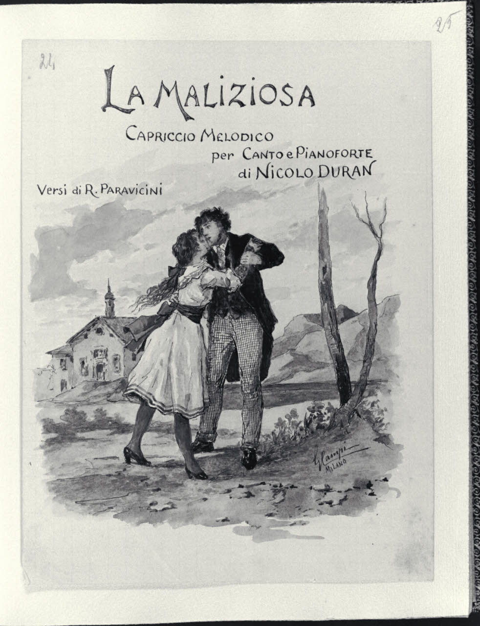 - NOTIZIE STORICO CRITICHE L’album inv. L B 15 del Civico Gabinetto dei Disegni del Castello Sforzesco, raccoglie una serie di illustrazioni realizzate da Giacomo Campi (1846 - 1921). Donato al Comune di Milano da Luigi Donnini nel 1937, è composto da 61 fogli montati su 63 pagine di carta color avorio dove su ognuna di esse è indicato a matita il corrispettivo numero progressivo dei diversi fogli. I disegni, tutti firmati"Giacomo Campi. Milano", sono stati realizzati come frontespizi di spettacoli musicali, canzoni e ballate composte da Nicolò Duran; i versi di alcune di queste composizioni sono invece di U. Barbieri, E. Boccola, F. Cavallotti, G. E. Ducati, G. Giacchi, R. Paravicini, L. Stecchetti, Q. Vivanti, J. Well. Tali opere grafiche, molte delle quali quadrettate a matita, sono realizzate con rapidi e veloci tratti di inchiostro nero e acquerelli colorati dalle vivaci e cangianti cromie. Su ogni foglio, nella parte superiore al centro, campeggia il titolo della composizione descritta con caratteri stilizzati, arabeschi vegetali e capilettera figurali. Le scene rappresentate hanno spesso ambientazioni che evocano il genere musicale e rimandano a un tipico gusto Liberty, che si trasforma in motivi rococò o neoclassici. Nelle diverse composizioni si osservano principalmente soggetti e figure di giovani innamorati che danzano, si guardano o assumono atteggiamenti e pose romantiche in ambienti bucolici o all’interno di ricche dimore. Difficile risulta, a oggi, stabilire una data certa per la loro esecuzione, ma è molto probabile che siano state realizzate in un lasso di tempo abbastanza ampio e verosimilmente dopo il 1871, anno in cui l’artista prese fissa dimora a Milano. Il pittore, prima di tale data, aveva infatti frequentato l’Accademia Carrara di Bergamo e successivamente l’Accademia di S. Luca a Roma. Nella Milano di fine Ottocento acquistò subito grande popolarità, prese attivamente parte a tutte le manifestazioni della "Scapigliatura" lombarda e si distinse come pittore di affreschi, scene di genere e acquafortista, oltre che come inconfondibile acquerellista.