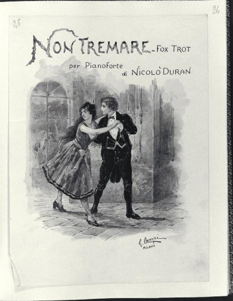 - NOTIZIE STORICO CRITICHE L’album inv. L B 15 del Civico Gabinetto dei Disegni del Castello Sforzesco, raccoglie una serie di illustrazioni realizzate da Giacomo Campi (1846 - 1921). Donato al Comune di Milano da Luigi Donnini nel 1937, è composto da 61 fogli montati su 63 pagine di carta color avorio dove su ognuna di esse è indicato a matita il corrispettivo numero progressivo dei diversi fogli. I disegni, tutti firmati"Giacomo Campi. Milano", sono stati realizzati come frontespizi di spettacoli musicali, canzoni e ballate composte da Nicolò Duran; i versi di alcune di queste composizioni sono invece di U. Barbieri, E. Boccola, F. Cavallotti, G. E. Ducati, G. Giacchi, R. Paravicini, L. Stecchetti, Q. Vivanti, J. Well. Tali opere grafiche, molte delle quali quadrettate a matita, sono realizzate con rapidi e veloci tratti di inchiostro nero e acquerelli colorati dalle vivaci e cangianti cromie. Su ogni foglio, nella parte superiore al centro, campeggia il titolo della composizione descritta con caratteri stilizzati, arabeschi vegetali e capilettera figurali. Le scene rappresentate hanno spesso ambientazioni che evocano il genere musicale e rimandano a un tipico gusto Liberty, che si trasforma in motivi rococò o neoclassici. Nelle diverse composizioni si osservano principalmente soggetti e figure di giovani innamorati che danzano, si guardano o assumono atteggiamenti e pose romantiche in ambienti bucolici o all’interno di ricche dimore. Difficile risulta, a oggi, stabilire una data certa per la loro esecuzione, ma è molto probabile che siano state realizzate in un lasso di tempo abbastanza ampio e verosimilmente dopo il 1871, anno in cui l’artista prese fissa dimora a Milano. Il pittore, prima di tale data, aveva infatti frequentato l’Accademia Carrara di Bergamo e successivamente l’Accademia di S. Luca a Roma. Nella Milano di fine Ottocento acquistò subito grande popolarità, prese attivamente parte a tutte le manifestazioni della "Scapigliatura" lombarda e si distinse come pittore di affreschi, scene di genere e acquafortista, oltre che come inconfondibile acquerellista.