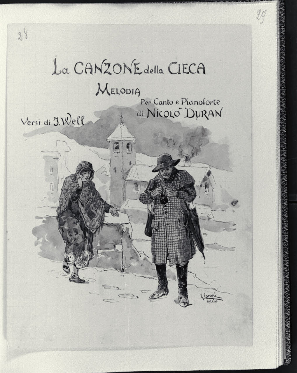 - NOTIZIE STORICO CRITICHE L’album inv. L B 15 del Civico Gabinetto dei Disegni del Castello Sforzesco, raccoglie una serie di illustrazioni realizzate da Giacomo Campi (1846 - 1921). Donato al Comune di Milano da Luigi Donnini nel 1937, è composto da 61 fogli montati su 63 pagine di carta color avorio dove su ognuna di esse è indicato a matita il corrispettivo numero progressivo dei diversi fogli. I disegni, tutti firmati"Giacomo Campi. Milano", sono stati realizzati come frontespizi di spettacoli musicali, canzoni e ballate composte da Nicolò Duran; i versi di alcune di queste composizioni sono invece di U. Barbieri, E. Boccola, F. Cavallotti, G. E. Ducati, G. Giacchi, R. Paravicini, L. Stecchetti, Q. Vivanti, J. Well. Tali opere grafiche, molte delle quali quadrettate a matita, sono realizzate con rapidi e veloci tratti di inchiostro nero e acquerelli colorati dalle vivaci e cangianti cromie. Su ogni foglio, nella parte superiore al centro, campeggia il titolo della composizione descritta con caratteri stilizzati, arabeschi vegetali e capilettera figurali. Le scene rappresentate hanno spesso ambientazioni che evocano il genere musicale e rimandano a un tipico gusto Liberty, che si trasforma in motivi rococò o neoclassici. Nelle diverse composizioni si osservano principalmente soggetti e figure di giovani innamorati che danzano, si guardano o assumono atteggiamenti e pose romantiche in ambienti bucolici o all’interno di ricche dimore. Difficile risulta, a oggi, stabilire una data certa per la loro esecuzione, ma è molto probabile che siano state realizzate in un lasso di tempo abbastanza ampio e verosimilmente dopo il 1871, anno in cui l’artista prese fissa dimora a Milano. Il pittore, prima di tale data, aveva infatti frequentato l’Accademia Carrara di Bergamo e successivamente l’Accademia di S. Luca a Roma. Nella Milano di fine Ottocento acquistò subito grande popolarità, prese attivamente parte a tutte le manifestazioni della "Scapigliatura" lombarda e si distinse come pittore di affreschi, scene di genere e acquafortista, oltre che come inconfondibile acquerellista.