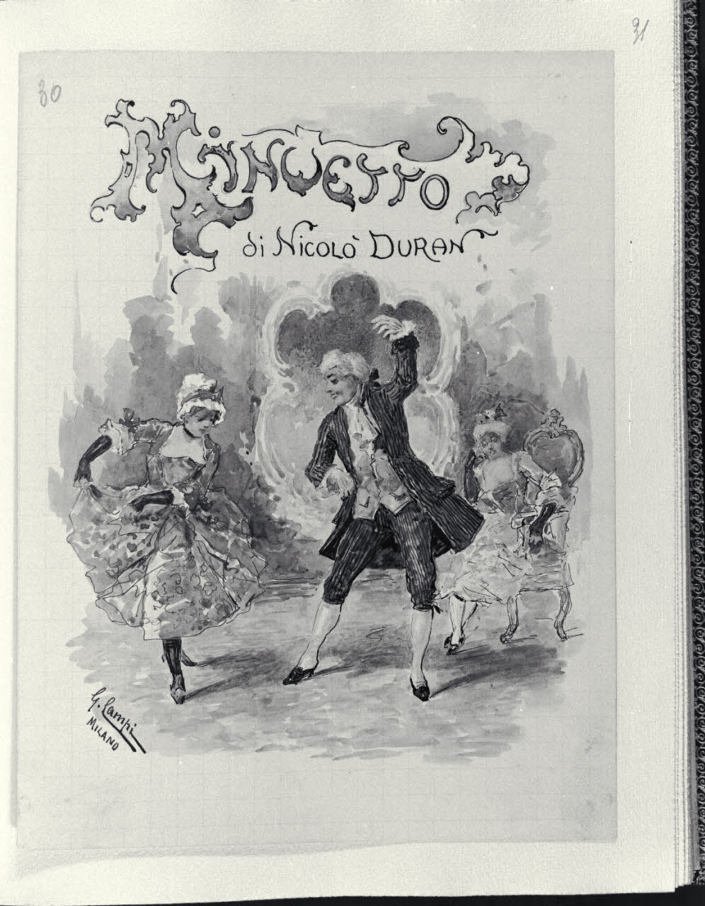 - NOTIZIE STORICO CRITICHE L’album inv. L B 15 del Civico Gabinetto dei Disegni del Castello Sforzesco, raccoglie una serie di illustrazioni realizzate da Giacomo Campi (1846 - 1921). Donato al Comune di Milano da Luigi Donnini nel 1937, è composto da 61 fogli montati su 63 pagine di carta color avorio dove su ognuna di esse è indicato a matita il corrispettivo numero progressivo dei diversi fogli. I disegni, tutti firmati"Giacomo Campi. Milano", sono stati realizzati come frontespizi di spettacoli musicali, canzoni e ballate composte da Nicolò Duran; i versi di alcune di queste composizioni sono invece di U. Barbieri, E. Boccola, F. Cavallotti, G. E. Ducati, G. Giacchi, R. Paravicini, L. Stecchetti, Q. Vivanti, J. Well. Tali opere grafiche, molte delle quali quadrettate a matita, sono realizzate con rapidi e veloci tratti di inchiostro nero e acquerelli colorati dalle vivaci e cangianti cromie. Su ogni foglio, nella parte superiore al centro, campeggia il titolo della composizione descritta con caratteri stilizzati, arabeschi vegetali e capilettera figurali. Le scene rappresentate hanno spesso ambientazioni che evocano il genere musicale e rimandano a un tipico gusto Liberty, che si trasforma in motivi rococò o neoclassici. Nelle diverse composizioni si osservano principalmente soggetti e figure di giovani innamorati che danzano, si guardano o assumono atteggiamenti e pose romantiche in ambienti bucolici o all’interno di ricche dimore. Difficile risulta, a oggi, stabilire una data certa per la loro esecuzione, ma è molto probabile che siano state realizzate in un lasso di tempo abbastanza ampio e verosimilmente dopo il 1871, anno in cui l’artista prese fissa dimora a Milano. Il pittore, prima di tale data, aveva infatti frequentato l’Accademia Carrara di Bergamo e successivamente l’Accademia di S. Luca a Roma. Nella Milano di fine Ottocento acquistò subito grande popolarità, prese attivamente parte a tutte le manifestazioni della "Scapigliatura" lombarda e si distinse come pittore di affreschi, scene di genere e acquafortista, oltre che come inconfondibile acquerellista.