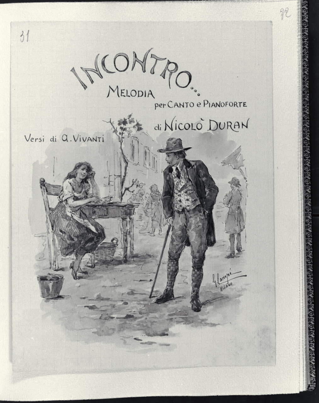 - NOTIZIE STORICO CRITICHE L’album inv. L B 15 del Civico Gabinetto dei Disegni del Castello Sforzesco, raccoglie una serie di illustrazioni realizzate da Giacomo Campi (1846 - 1921). Donato al Comune di Milano da Luigi Donnini nel 1937, è composto da 61 fogli montati su 63 pagine di carta color avorio dove su ognuna di esse è indicato a matita il corrispettivo numero progressivo dei diversi fogli. I disegni, tutti firmati"Giacomo Campi. Milano", sono stati realizzati come frontespizi di spettacoli musicali, canzoni e ballate composte da Nicolò Duran; i versi di alcune di queste composizioni sono invece di U. Barbieri, E. Boccola, F. Cavallotti, G. E. Ducati, G. Giacchi, R. Paravicini, L. Stecchetti, Q. Vivanti, J. Well. Tali opere grafiche, molte delle quali quadrettate a matita, sono realizzate con rapidi e veloci tratti di inchiostro nero e acquerelli colorati dalle vivaci e cangianti cromie. Su ogni foglio, nella parte superiore al centro, campeggia il titolo della composizione descritta con caratteri stilizzati, arabeschi vegetali e capilettera figurali. Le scene rappresentate hanno spesso ambientazioni che evocano il genere musicale e rimandano a un tipico gusto Liberty, che si trasforma in motivi rococò o neoclassici. Nelle diverse composizioni si osservano principalmente soggetti e figure di giovani innamorati che danzano, si guardano o assumono atteggiamenti e pose romantiche in ambienti bucolici o all’interno di ricche dimore. Difficile risulta, a oggi, stabilire una data certa per la loro esecuzione, ma è molto probabile che siano state realizzate in un lasso di tempo abbastanza ampio e verosimilmente dopo il 1871, anno in cui l’artista prese fissa dimora a Milano. Il pittore, prima di tale data, aveva infatti frequentato l’Accademia Carrara di Bergamo e successivamente l’Accademia di S. Luca a Roma. Nella Milano di fine Ottocento acquistò subito grande popolarità, prese attivamente parte a tutte le manifestazioni della "Scapigliatura" lombarda e si distinse come pittore di affreschi, scene di genere e acquafortista, oltre che come inconfondibile acquerellista.