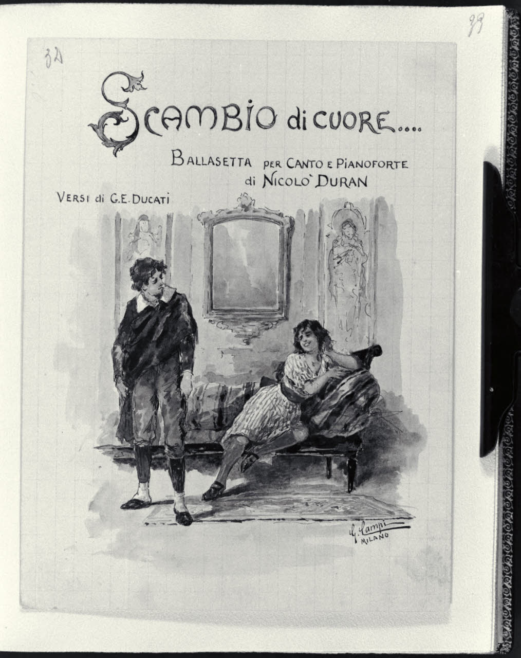 - NOTIZIE STORICO CRITICHE L’album inv. L B 15 del Civico Gabinetto dei Disegni del Castello Sforzesco, raccoglie una serie di illustrazioni realizzate da Giacomo Campi (1846 - 1921). Donato al Comune di Milano da Luigi Donnini nel 1937, è composto da 61 fogli montati su 63 pagine di carta color avorio dove su ognuna di esse è indicato a matita il corrispettivo numero progressivo dei diversi fogli. I disegni, tutti firmati"Giacomo Campi. Milano", sono stati realizzati come frontespizi di spettacoli musicali, canzoni e ballate composte da Nicolò Duran; i versi di alcune di queste composizioni sono invece di U. Barbieri, E. Boccola, F. Cavallotti, G. E. Ducati, G. Giacchi, R. Paravicini, L. Stecchetti, Q. Vivanti, J. Well. Tali opere grafiche, molte delle quali quadrettate a matita, sono realizzate con rapidi e veloci tratti di inchiostro nero e acquerelli colorati dalle vivaci e cangianti cromie. Su ogni foglio, nella parte superiore al centro, campeggia il titolo della composizione descritta con caratteri stilizzati, arabeschi vegetali e capilettera figurali. Le scene rappresentate hanno spesso ambientazioni che evocano il genere musicale e rimandano a un tipico gusto Liberty, che si trasforma in motivi rococò o neoclassici. Nelle diverse composizioni si osservano principalmente soggetti e figure di giovani innamorati che danzano, si guardano o assumono atteggiamenti e pose romantiche in ambienti bucolici o all’interno di ricche dimore. Difficile risulta, a oggi, stabilire una data certa per la loro esecuzione, ma è molto probabile che siano state realizzate in un lasso di tempo abbastanza ampio e verosimilmente dopo il 1871, anno in cui l’artista prese fissa dimora a Milano. Il pittore, prima di tale data, aveva infatti frequentato l’Accademia Carrara di Bergamo e successivamente l’Accademia di S. Luca a Roma. Nella Milano di fine Ottocento acquistò subito grande popolarità, prese attivamente parte a tutte le manifestazioni della "Scapigliatura" lombarda e si distinse come pittore di affreschi, scene di genere e acquafortista, oltre che come inconfondibile acquerellista.