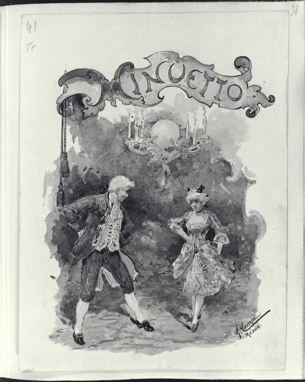 - NOTIZIE STORICO CRITICHE L’album inv. L B 15 del Civico Gabinetto dei Disegni del Castello Sforzesco, raccoglie una serie di illustrazioni realizzate da Giacomo Campi (1846 - 1921). Donato al Comune di Milano da Luigi Donnini nel 1937, è composto da 61 fogli montati su 63 pagine di carta color avorio dove su ognuna di esse è indicato a matita il corrispettivo numero progressivo dei diversi fogli. I disegni, tutti firmati"Giacomo Campi. Milano", sono stati realizzati come frontespizi di spettacoli musicali, canzoni e ballate composte da Nicolò Duran; i versi di alcune di queste composizioni sono invece di U. Barbieri, E. Boccola, F. Cavallotti, G. E. Ducati, G. Giacchi, R. Paravicini, L. Stecchetti, Q. Vivanti, J. Well. Tali opere grafiche, molte delle quali quadrettate a matita, sono realizzate con rapidi e veloci tratti di inchiostro nero e acquerelli colorati dalle vivaci e cangianti cromie. Su ogni foglio, nella parte superiore al centro, campeggia il titolo della composizione descritta con caratteri stilizzati, arabeschi vegetali e capilettera figurali. Le scene rappresentate hanno spesso ambientazioni che evocano il genere musicale e rimandano a un tipico gusto Liberty, che si trasforma in motivi rococò o neoclassici. Nelle diverse composizioni si osservano principalmente soggetti e figure di giovani innamorati che danzano, si guardano o assumono atteggiamenti e pose romantiche in ambienti bucolici o all’interno di ricche dimore. Difficile risulta, a oggi, stabilire una data certa per la loro esecuzione, ma è molto probabile che siano state realizzate in un lasso di tempo abbastanza ampio e verosimilmente dopo il 1871, anno in cui l’artista prese fissa dimora a Milano. Il pittore, prima di tale data, aveva infatti frequentato l’Accademia Carrara di Bergamo e successivamente l’Accademia di S. Luca a Roma. Nella Milano di fine Ottocento acquistò subito grande popolarità, prese attivamente parte a tutte le manifestazioni della "Scapigliatura" lombarda e si distinse come pittore di affreschi, scene di genere e acquafortista, oltre che come inconfondibile acquerellista.