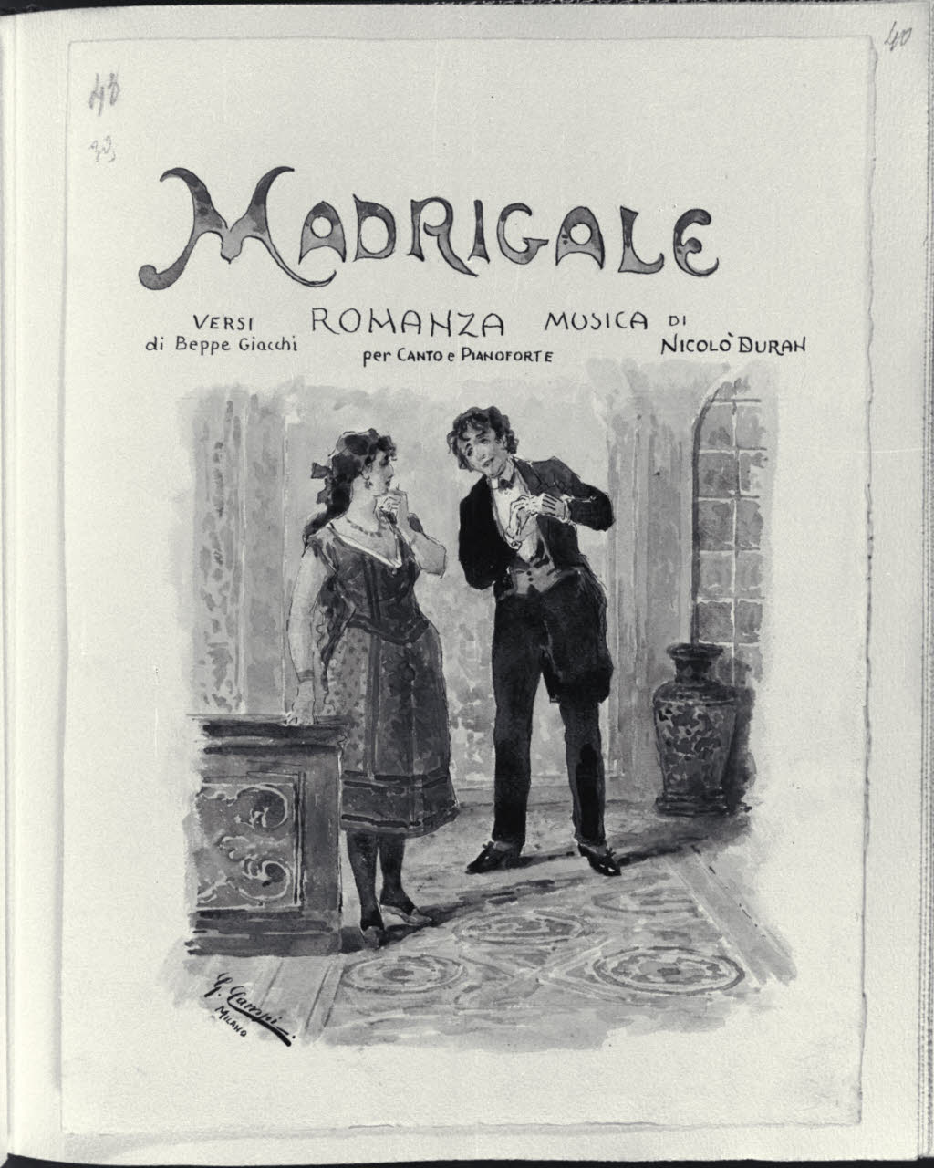 - NOTIZIE STORICO CRITICHE L’album inv. L B 15 del Civico Gabinetto dei Disegni del Castello Sforzesco, raccoglie una serie di illustrazioni realizzate da Giacomo Campi (1846 - 1921). Donato al Comune di Milano da Luigi Donnini nel 1937, è composto da 61 fogli montati su 63 pagine di carta color avorio dove su ognuna di esse è indicato a matita il corrispettivo numero progressivo dei diversi fogli. I disegni, tutti firmati"Giacomo Campi. Milano", sono stati realizzati come frontespizi di spettacoli musicali, canzoni e ballate composte da Nicolò Duran; i versi di alcune di queste composizioni sono invece di U. Barbieri, E. Boccola, F. Cavallotti, G. E. Ducati, G. Giacchi, R. Paravicini, L. Stecchetti, Q. Vivanti, J. Well. Tali opere grafiche, molte delle quali quadrettate a matita, sono realizzate con rapidi e veloci tratti di inchiostro nero e acquerelli colorati dalle vivaci e cangianti cromie. Su ogni foglio, nella parte superiore al centro, campeggia il titolo della composizione descritta con caratteri stilizzati, arabeschi vegetali e capilettera figurali. Le scene rappresentate hanno spesso ambientazioni che evocano il genere musicale e rimandano a un tipico gusto Liberty, che si trasforma in motivi rococò o neoclassici. Nelle diverse composizioni si osservano principalmente soggetti e figure di giovani innamorati che danzano, si guardano o assumono atteggiamenti e pose romantiche in ambienti bucolici o all’interno di ricche dimore. Difficile risulta, a oggi, stabilire una data certa per la loro esecuzione, ma è molto probabile che siano state realizzate in un lasso di tempo abbastanza ampio e verosimilmente dopo il 1871, anno in cui l’artista prese fissa dimora a Milano. Il pittore, prima di tale data, aveva infatti frequentato l’Accademia Carrara di Bergamo e successivamente l’Accademia di S. Luca a Roma. Nella Milano di fine Ottocento acquistò subito grande popolarità, prese attivamente parte a tutte le manifestazioni della "Scapigliatura" lombarda e si distinse come pittore di affreschi, scene di genere e acquafortista, oltre che come inconfondibile acquerellista.