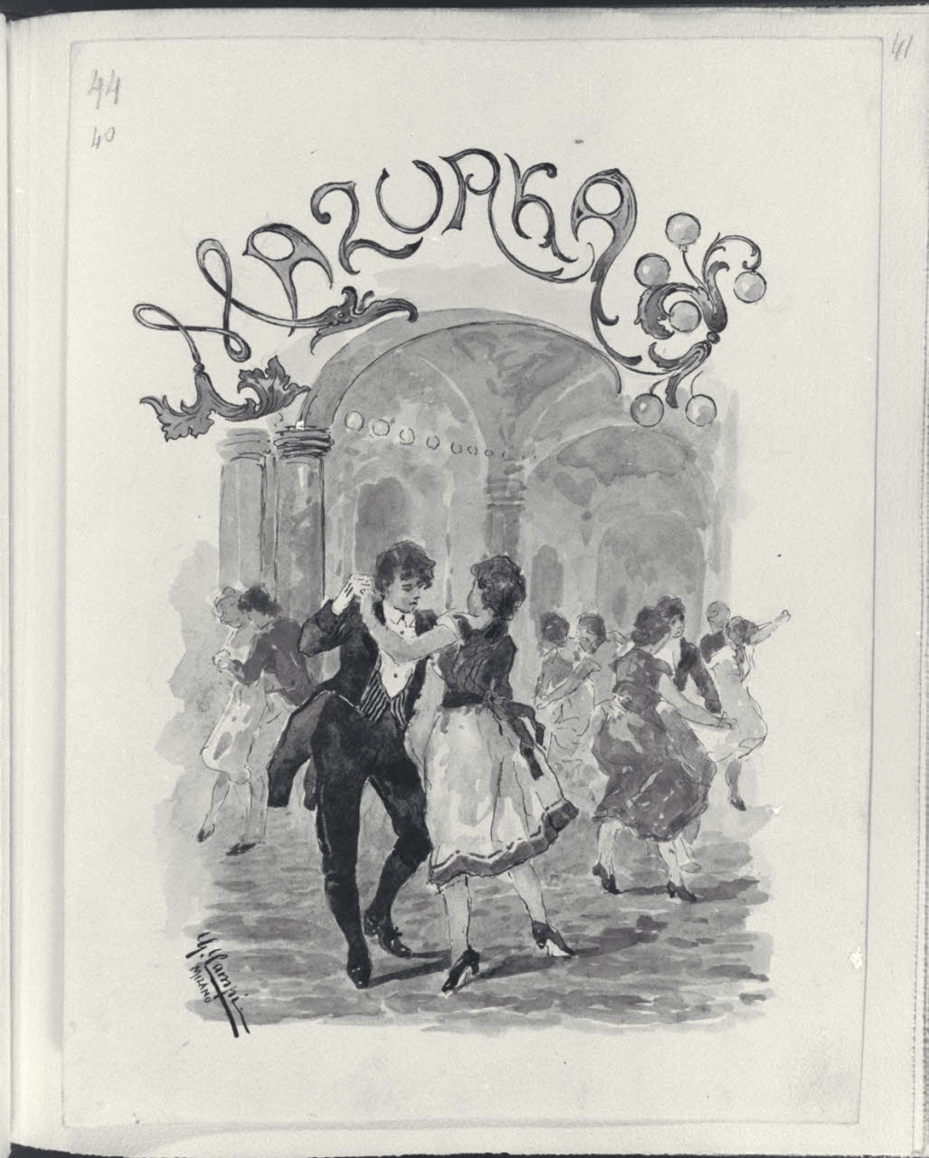- NOTIZIE STORICO CRITICHE L’album inv. L B 15 del Civico Gabinetto dei Disegni del Castello Sforzesco, raccoglie una serie di illustrazioni realizzate da Giacomo Campi (1846 - 1921). Donato al Comune di Milano da Luigi Donnini nel 1937, è composto da 61 fogli montati su 63 pagine di carta color avorio dove su ognuna di esse è indicato a matita il corrispettivo numero progressivo dei diversi fogli. I disegni, tutti firmati"Giacomo Campi. Milano", sono stati realizzati come frontespizi di spettacoli musicali, canzoni e ballate composte da Nicolò Duran; i versi di alcune di queste composizioni sono invece di U. Barbieri, E. Boccola, F. Cavallotti, G. E. Ducati, G. Giacchi, R. Paravicini, L. Stecchetti, Q. Vivanti, J. Well. Tali opere grafiche, molte delle quali quadrettate a matita, sono realizzate con rapidi e veloci tratti di inchiostro nero e acquerelli colorati dalle vivaci e cangianti cromie. Su ogni foglio, nella parte superiore al centro, campeggia il titolo della composizione descritta con caratteri stilizzati, arabeschi vegetali e capilettera figurali. Le scene rappresentate hanno spesso ambientazioni che evocano il genere musicale e rimandano a un tipico gusto Liberty, che si trasforma in motivi rococò o neoclassici. Nelle diverse composizioni si osservano principalmente soggetti e figure di giovani innamorati che danzano, si guardano o assumono atteggiamenti e pose romantiche in ambienti bucolici o all’interno di ricche dimore. Difficile risulta, a oggi, stabilire una data certa per la loro esecuzione, ma è molto probabile che siano state realizzate in un lasso di tempo abbastanza ampio e verosimilmente dopo il 1871, anno in cui l’artista prese fissa dimora a Milano. Il pittore, prima di tale data, aveva infatti frequentato l’Accademia Carrara di Bergamo e successivamente l’Accademia di S. Luca a Roma. Nella Milano di fine Ottocento acquistò subito grande popolarità, prese attivamente parte a tutte le manifestazioni della "Scapigliatura" lombarda e si distinse come pittore di affreschi, scene di genere e acquafortista, oltre che come inconfondibile acquerellista.