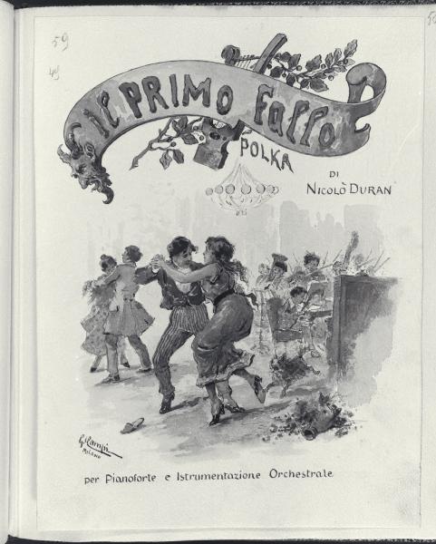 - NOTIZIE STORICO CRITICHE L’album inv. L B 15 del Civico Gabinetto dei Disegni del Castello Sforzesco, raccoglie una serie di illustrazioni realizzate da Giacomo Campi (1846 - 1921). Donato al Comune di Milano da Luigi Donnini nel 1937, è composto da 61 fogli montati su 63 pagine di carta color avorio dove su ognuna di esse è indicato a matita il corrispettivo numero progressivo dei diversi fogli. I disegni, tutti firmati"Giacomo Campi. Milano", sono stati realizzati come frontespizi di spettacoli musicali, canzoni e ballate composte da Nicolò Duran; i versi di alcune di queste composizioni sono invece di U. Barbieri, E. Boccola, F. Cavallotti, G. E. Ducati, G. Giacchi, R. Paravicini, L. Stecchetti, Q. Vivanti, J. Well. Tali opere grafiche, molte delle quali quadrettate a matita, sono realizzate con rapidi e veloci tratti di inchiostro nero e acquerelli colorati dalle vivaci e cangianti cromie. Su ogni foglio, nella parte superiore al centro, campeggia il titolo della composizione descritta con caratteri stilizzati, arabeschi vegetali e capilettera figurali. Le scene rappresentate hanno spesso ambientazioni che evocano il genere musicale e rimandano a un tipico gusto Liberty, che si trasforma in motivi rococò o neoclassici. Nelle diverse composizioni si osservano principalmente soggetti e figure di giovani innamorati che danzano, si guardano o assumono atteggiamenti e pose romantiche in ambienti bucolici o all’interno di ricche dimore. Difficile risulta, a oggi, stabilire una data certa per la loro esecuzione, ma è molto probabile che siano state realizzate in un lasso di tempo abbastanza ampio e verosimilmente dopo il 1871, anno in cui l’artista prese fissa dimora a Milano. Il pittore, prima di tale data, aveva infatti frequentato l’Accademia Carrara di Bergamo e successivamente l’Accademia di S. Luca a Roma. Nella Milano di fine Ottocento acquistò subito grande popolarità, prese attivamente parte a tutte le manifestazioni della "Scapigliatura" lombarda e si distinse come pittore di affreschi, scene di genere e acquafortista, oltre che come inconfondibile acquerellista.