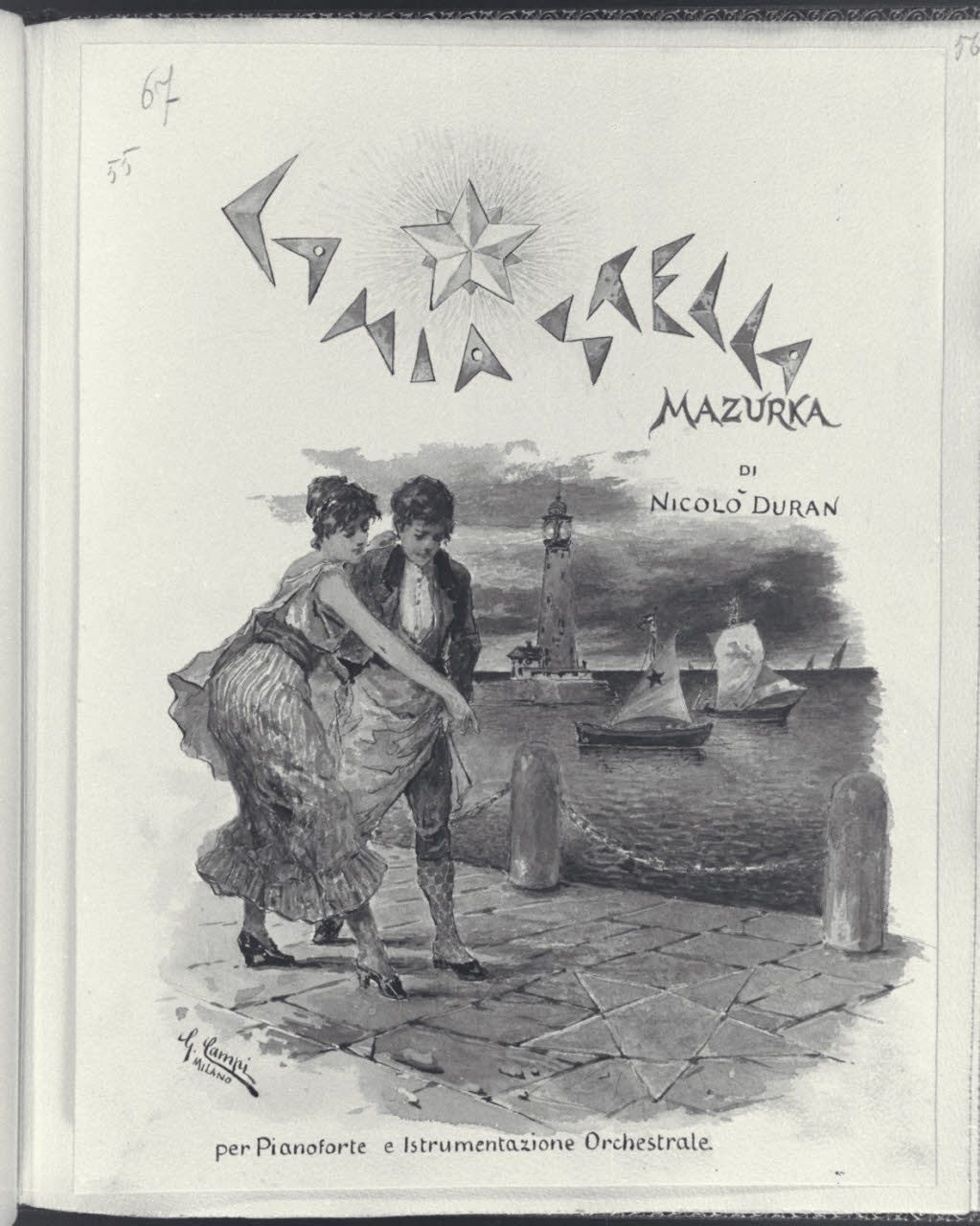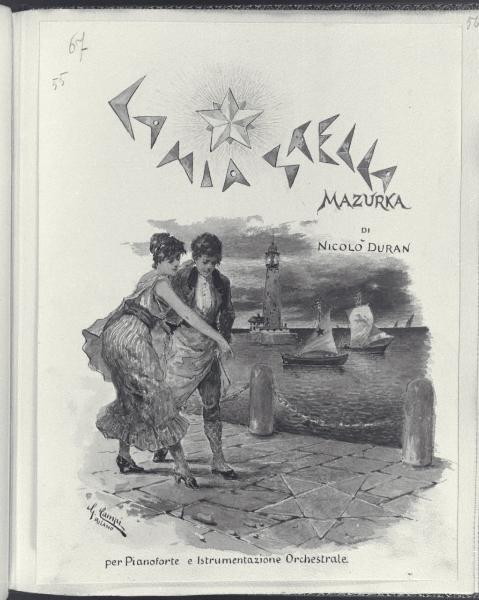 - NOTIZIE STORICO CRITICHE L’album inv. L B 15 del Civico Gabinetto dei Disegni del Castello Sforzesco, raccoglie una serie di illustrazioni realizzate da Giacomo Campi (1846 - 1921). Donato al Comune di Milano da Luigi Donnini nel 1937, è composto da 61 fogli montati su 63 pagine di carta color avorio dove su ognuna di esse è indicato a matita il corrispettivo numero progressivo dei diversi fogli. I disegni, tutti firmati"Giacomo Campi. Milano", sono stati realizzati come frontespizi di spettacoli musicali, canzoni e ballate composte da Nicolò Duran; i versi di alcune di queste composizioni sono invece di U. Barbieri, E. Boccola, F. Cavallotti, G. E. Ducati, G. Giacchi, R. Paravicini, L. Stecchetti, Q. Vivanti, J. Well. Tali opere grafiche, molte delle quali quadrettate a matita, sono realizzate con rapidi e veloci tratti di inchiostro nero e acquerelli colorati dalle vivaci e cangianti cromie. Su ogni foglio, nella parte superiore al centro, campeggia il titolo della composizione descritta con caratteri stilizzati, arabeschi vegetali e capilettera figurali. Le scene rappresentate hanno spesso ambientazioni che evocano il genere musicale e rimandano a un tipico gusto Liberty, che si trasforma in motivi rococò o neoclassici. Nelle diverse composizioni si osservano principalmente soggetti e figure di giovani innamorati che danzano, si guardano o assumono atteggiamenti e pose romantiche in ambienti bucolici o all’interno di ricche dimore. Difficile risulta, a oggi, stabilire una data certa per la loro esecuzione, ma è molto probabile che siano state realizzate in un lasso di tempo abbastanza ampio e verosimilmente dopo il 1871, anno in cui l’artista prese fissa dimora a Milano. Il pittore, prima di tale data, aveva infatti frequentato l’Accademia Carrara di Bergamo e successivamente l’Accademia di S. Luca a Roma. Nella Milano di fine Ottocento acquistò subito grande popolarità, prese attivamente parte a tutte le manifestazioni della "Scapigliatura" lombarda e si distinse come pittore di affreschi, scene di genere e acquafortista, oltre che come inconfondibile acquerellista.