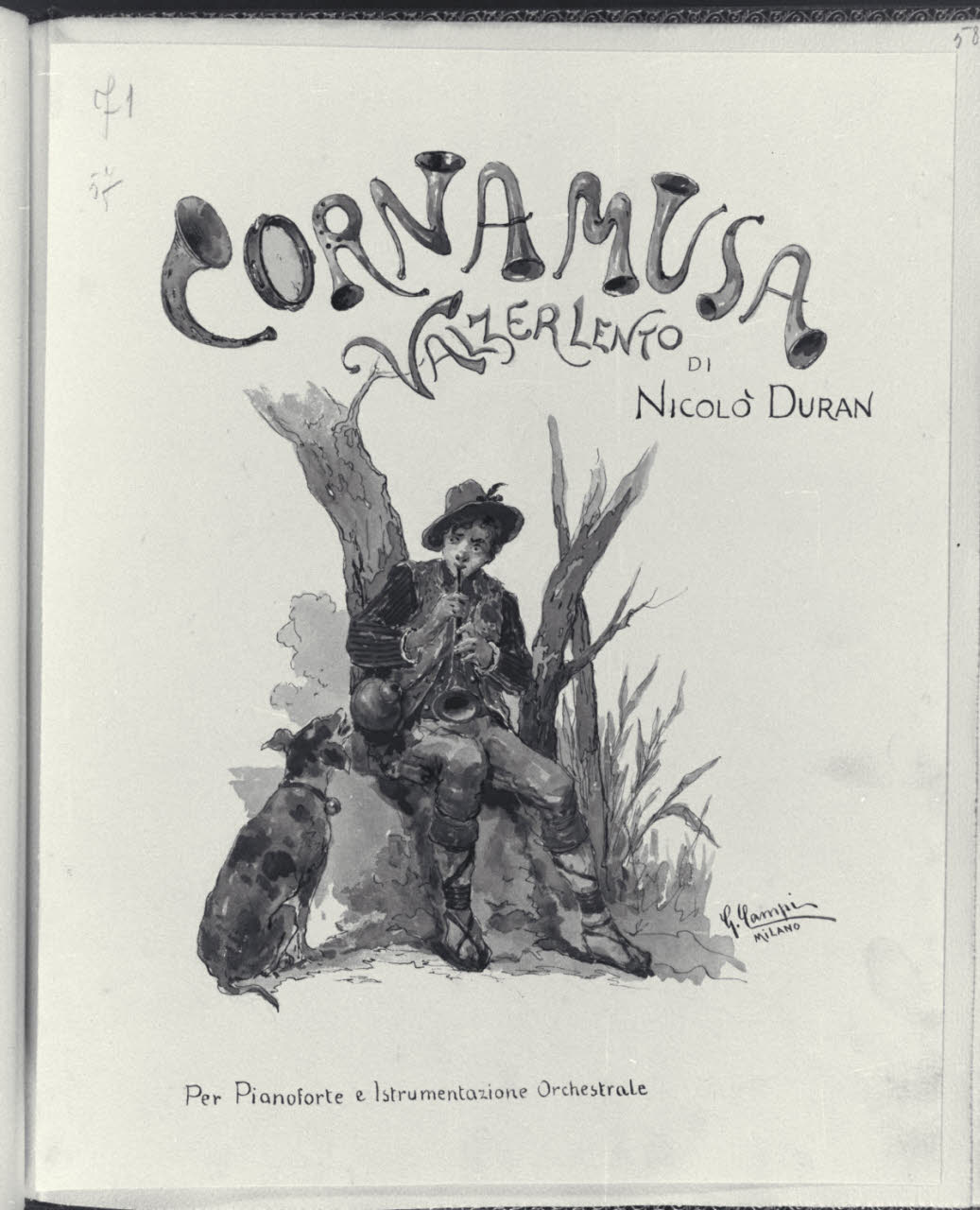 - NOTIZIE STORICO CRITICHE L’album inv. L B 15 del Civico Gabinetto dei Disegni del Castello Sforzesco, raccoglie una serie di illustrazioni realizzate da Giacomo Campi (1846 - 1921). Donato al Comune di Milano da Luigi Donnini nel 1937, è composto da 61 fogli montati su 63 pagine di carta color avorio dove su ognuna di esse è indicato a matita il corrispettivo numero progressivo dei diversi fogli. I disegni, tutti firmati"Giacomo Campi. Milano", sono stati realizzati come frontespizi di spettacoli musicali, canzoni e ballate composte da Nicolò Duran; i versi di alcune di queste composizioni sono invece di U. Barbieri, E. Boccola, F. Cavallotti, G. E. Ducati, G. Giacchi, R. Paravicini, L. Stecchetti, Q. Vivanti, J. Well. Tali opere grafiche, molte delle quali quadrettate a matita, sono realizzate con rapidi e veloci tratti di inchiostro nero e acquerelli colorati dalle vivaci e cangianti cromie. Su ogni foglio, nella parte superiore al centro, campeggia il titolo della composizione descritta con caratteri stilizzati, arabeschi vegetali e capilettera figurali. Le scene rappresentate hanno spesso ambientazioni che evocano il genere musicale e rimandano a un tipico gusto Liberty, che si trasforma in motivi rococò o neoclassici. Nelle diverse composizioni si osservano principalmente soggetti e figure di giovani innamorati che danzano, si guardano o assumono atteggiamenti e pose romantiche in ambienti bucolici o all’interno di ricche dimore. Difficile risulta, a oggi, stabilire una data certa per la loro esecuzione, ma è molto probabile che siano state realizzate in un lasso di tempo abbastanza ampio e verosimilmente dopo il 1871, anno in cui l’artista prese fissa dimora a Milano. Il pittore, prima di tale data, aveva infatti frequentato l’Accademia Carrara di Bergamo e successivamente l’Accademia di S. Luca a Roma. Nella Milano di fine Ottocento acquistò subito grande popolarità, prese attivamente parte a tutte le manifestazioni della "Scapigliatura" lombarda e si distinse come pittore di affreschi, scene di genere e acquafortista, oltre che come inconfondibile acquerellista.