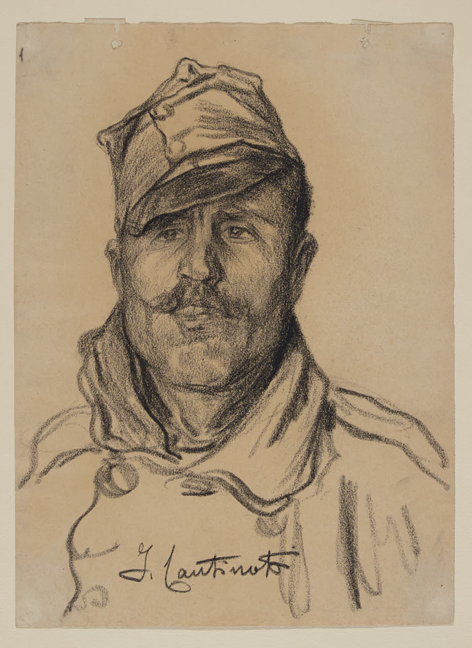 - NOTIZIE STORICO CRITICHE Studente di pittura all’Accademia di Brera, nel 1895 Innocente Cantinotti si iscrisse alla Famiglia Artistica partecipando attivamente alle esposizioni organizzate dall’Associazione. Allo scoppio della Prima Guerra Mondiale, dopo un breve corso da ufficiale, l’artista partì per il fronte come panoramista con il compito di registrare, attraverso la sua matita, l’andamento della linea nemica. Nel corso della guerra realizzò, su semplici fogli d’album, una serie di opere grafiche di grande spessore emotivo, raffiguranti paesaggi, rovine e ritratti di soldati al fronte osservati da diversi punti di vista (S. Marra, Artisti al fronte. La grafica di Innocente Cantinotti, in "L’uomo Nero. Materiali per una storia delle arti della modernità", a. V n. 6, 2008, p. 381). Molte di queste testimonianze si conservano oggi all’interno delle Civiche Raccolte Storiche del comune di Milano, mentre un piccolo nucleo di ritratti con i "Prigionieri austriaci" è custodito presso il Civico Gabinetto di Disegni del Castello Sforzesco. Quest’ultimi fogli furono acquistati nel giugno del 1925 alla "Mostra degli artisti combattenti" ; una delle tante esposizioni del Gruppo degli Artisti Combattenti di cui Cantinotti fu socio fin dalla fondazione, avvenuta il 23 novembre del 1924 presso la Famiglia Artistica (Ivi.). I quattro disegni (Invv. 1573 B 556, 1574 B 557, 1576 B 559, 1576 B 559), realizzati probabilmente sul fronte del Piave - dove nel novembre del 1918 l’artista si trovava con l’ottava armata - descrivono, attraverso una restituzione meticolosa dei dettagli fisiognomici, quattro prigionieri austriaci di età differente. Sono opere dalla forte introspezione psicologica, prive di particolare ricercatezza formale, ma fortemente realistiche ed espressive. L’artista, infatti, senza nessuna retorica e attraverso un uso sapiente del chiaroscuro, dedica particolare attenzione agli stati d’animo degli effigiati, ai loro sguardi penetranti e ai volti scavati dalla sofferenza e dalla fame. Nella produzione grafica di Cantinotti tali opere mostrano una predilezione per il genere del ritratto e riescono a descrivere, "meglio ancora delle loro gesta[...], l’anima esegrabile dei nostri nemici" (cfr. Pittori Soldato al fronte, in "L’illustrazione italiana", a. XLVI n. 1, 1919, pp. 9-13).