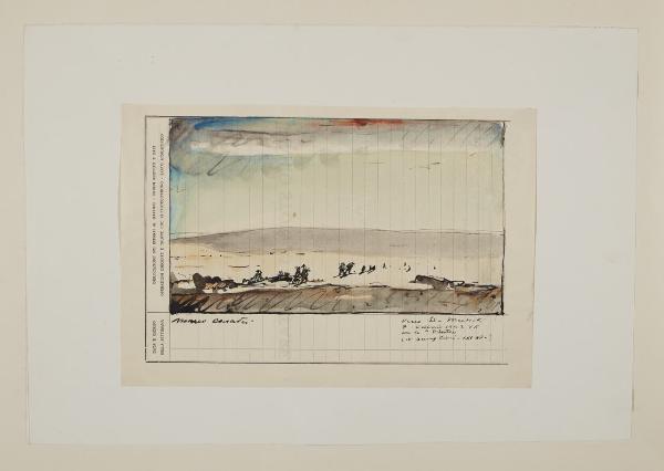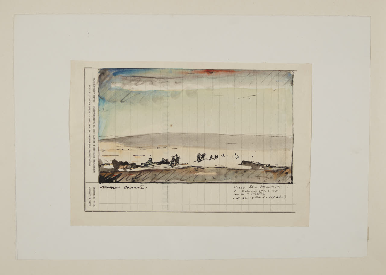 - NOTIZIE STORICO CRITICHE Quando nel 1940 l'Italia entrò in guerra a fianco della Germania, Maceo Casadei partì come volontario con il "reparto guerra", in qualità di pittore e fotoreporter per l'Istituto Nazionale Luce, con l'obbiettivo di documentare le operazioni belliche delle truppe italiane. Nelle sue memorie, scritte tra il 1950 e il 1960, l'artista forlivese racconta dettagliatamente tutti i momenti del conflitto a cui prese parte e offre un minuzioso resoconto della sua attività e dei suoi spostamenti. Delle sue esperienze si ha testimonianza nelle circa 6000 fotografie scattate e nelle oltre 400 "impressioni" realizzate in dipinti e disegni. Dopo alcune missioni nei mari italiani, e avendo girovagato in largo e in lungo per la penisola, nell'ottobre del 1941 Maceo si sposta in Africa settentrionale. Cosi scrive: "mi venne il desiderio di recarmi sui fronti in terra Africana, sicuro di poter raccogliere un maggior materiale di guerra, ed un diverso 'color locale' […] Dopo Tripoli, El Adem e Tobruk, ci dirigemmo a Bir-El-Gobi per riprendere le ultime fasi di una crudele battaglia" (A. Imbellone, Maceo: anni Romani, 1934-1944, Cinisello Balsamo 2008, p. 34). Nella primavera del 1942, dopo il passaggio da Dumini e Tauorga, Maceo chiese e ottenne il permesso di far ritorno a Roma, e tra il maggio e il giugno dello stesso anno allestisce alle Terme di Roma la sua prima personale di guerra, presentando una quarantina di opere. \nDal 30 settembre al 12 ottobre del 1942, invece, la Galleria milanese del Milione ospitò la seconda mostra di guerra di Maceo, questa volta formata da soli disegni e guazzi, per un totale di 32 fogli. Nel testo introduttivo alla mostra, firmato da Attilio Crespi, il critico sottolinea l'altissima capacità raggiunta dall'artista forlivese a far luce e inquadrare le scene, raccogliendo gesti e atteggiamenti attraverso una schietta emotività. Lo stesso Maceo ricorda nelle sue memorie manoscritte, il grande successo di critica e di pubblico ottenuto dalla mostra e la triste chiusura a causa del primo bombardamento aereo su Milano. Di questi disegni, secondo le parole dell'artista, 28 furono venduti: 8 acquistati da privati, 5 dal Museo del Rinascimento di Milano e la rimanenza dal comune del capoluogo lombardo e destinati alle Raccolte Bertarelli. A questi 15 fogli, oggi conservati all'interno del Civico Gabinetto di Disegni (invv. 1949/1 C 202/1 - 1949/15 C 202/15), si è aggiunto un altro nucleo donato dal pittore intorno agli inizi degli anni Sessanta. Essi comprendono alcune opere eseguite come le precedenti durante la campagna in Africa (invv. Agg. 239; 70; 228; 229; 234), e altri disegni datati al 1918, al 1943 e al 1944 (invv. Agg. 68-71; 228-238).\nI disegni di guerra di Maceo Casadei realizzati tra il 1941 e il 1942 si distaccano, nella maggior parte dei casi, dal tipico filone documentario per un carattere di sintetica immediatezza e vibrazione lirica del colore. Il mutare rapido della scena costringe l'artista a immortalare il gemito della raffigurazione tramite tratti veloci di inchiostro di china e linee spezzate in supporti cartacei, alcuni dei quali di fortuna: pagine di protocollo stampato, fogli di taccuino o di diario. Così scrisse "fotografo e disegno scarabocchiando fogli su fogli di carta d'ogni tipo e colore" (Ivi). Attraverso il filtro del suo sguardo Maceo concentra il dramma della guerra in una rappresentazione piena di dinamicità, dove il dolore non è raffigurato attraverso le figure, che risultano schematiche e abbozzate, ma in una resa violenta del conflitto armato. Attraverso un tratto veloce e schizzato con variazioni delicate di colore diluito, la guerra è tratteggiata in lontananza con i soldati in corteo tra le sterminate dune del deserto o all'interno di buche scavate nella terra; tra i mari in mezzo agli scontri navali o nei campi di battaglia tra i carri armati. Oltre a ciò Casadei realizza alcuni splendidi paesaggi di deserto inserendo in alcuni casi non solo i cortei delle truppe militari, ma anche piccole figurine schizzate o accampamenti di beduini. Inoltre, con l'intento di offrire il ricordo di quei terribili ma avventurosi momenti, ogni foglio è contraddistinto, oltre che da data e firma, dalla presenza di note autografe con il quale l'artista regista le vicende che raffigura.