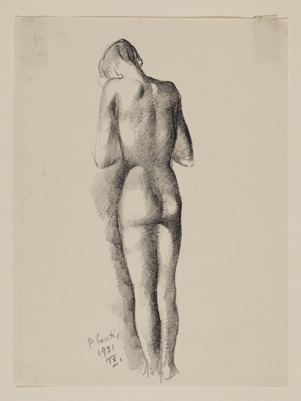 - NOTIZIE STORICO CRITICHE La fase centrale della lunga attività artistica di Primo Conti, è sicuramente quella più ricca di fermenti e sviluppi, a volte anche contradditori. Alla base dei disegni e delle opere che l'artista realizza intorno agli anni Trenta vi è inoltre un atteggiamento fortemente analitico e contemplativo. Nel foglio inedito con una figura femminile nuda vista da tergo, Conti dispone la giovane donna all'interno di uno spazio privo di ambientazione. \nLe morbide forme del corpo sono ottenute mediante l'uso di linee oblique parallele che si infittiscono fino a creare intense sfumature, in un uso calibrato del chiaroscuro che richiama ombreggiature di matrice seicentesca. Così come l'intero nucleo grafico dell'artista fiorentino conservato presso il Civico Gabinetto di Disegno del Castello Sforzesco, il disegno è stato donato da Primo Conti nel 1932 alla raccolte pubbliche milanesi.