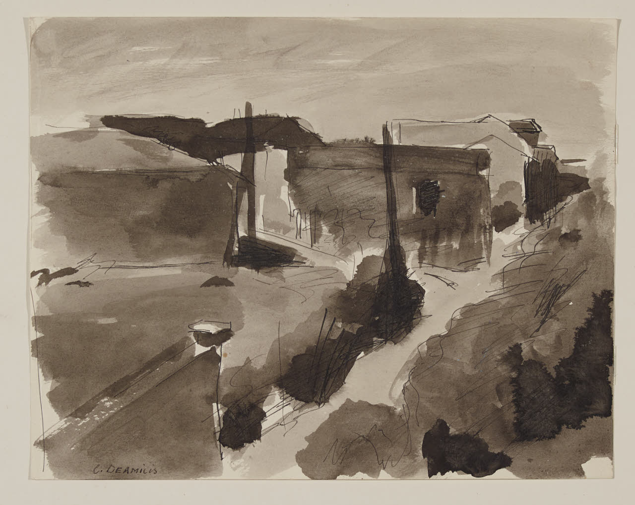 - NOTIZIE STORICO CRITICHE Le opere di Cristoforo De Amicis, all'inizio della sua carriera, sono caratterizzate da un linguaggio vicino alla pittura del "Novecento", gruppo con il quale espone in numerose mostre all'interno di gallerie private o in esposizioni pubbliche in Italia e all'estero. Successivamente, viene influenzato dalle correnti provenienti dalla Francia, e introduce nelle sue opere contrasti cromatici e una maggiore semplificazione delle forme. \nIl disegno intitolato "Paesaggio urbano" è entrato all'interno delle collezioni pubbliche milanesi dopo l'acquisto nel 1931 dalla Galleria del Milione. Esso è stilisticamente affine agli esempi dei suoi esordi, quando, abbandonato il novecentismo degli inizi, si avvicina alla lezione compiuta di Cézanne. Secondo quando ricostruito da Elena Vilardi, è probabile che l'opera sia stata presentata in occasione della mostra in Libreria insieme ai disegni di Ghiringhelli e Vitali (Vilardi 2001-2002). Nel disegno, il paesaggio urbano è rappresentato attraverso una costruzione architettonica di masse quadrate, mediante un tratto sottile che definisce i volumi delle case; queste ultime, ricoperte da macchie d'inchiostro, sono sfumate da variazioni di colore grigiastro.