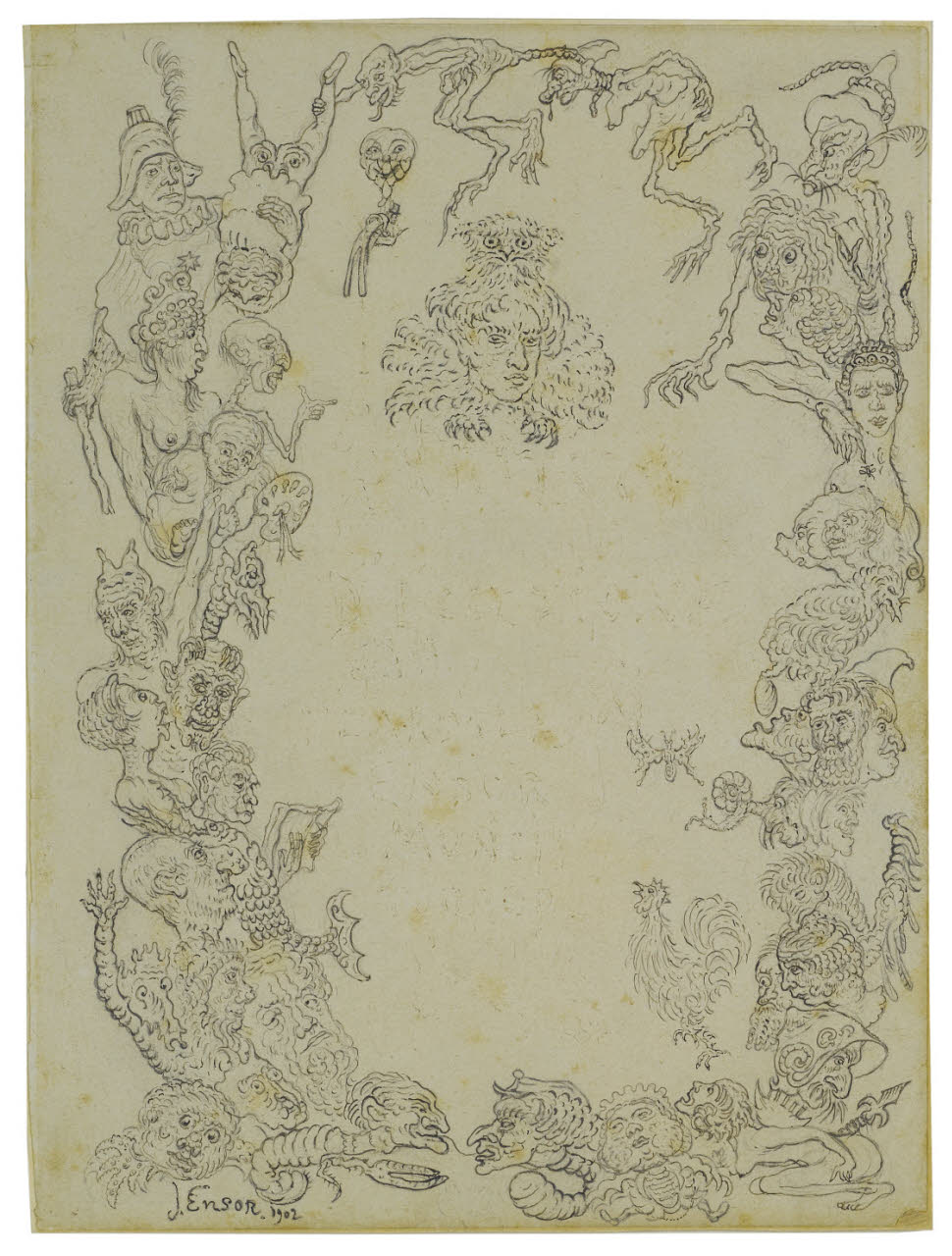 - NOTIZIE STORICO CRITICHE Nell'opera di Ensor il grottesco si mescola ai modelli della tradizione figurativa fiamminga, a Bosch e a Bruegel, ma con una visione individualizzata, visionaria, popolaresca e plebea tutta personale. Come nella sua pittura, anche nei disegni, ricorrenti sono le figure mostruose e le metamorfosi umane, attraverso cui l'artista belga critica aspramente la società del suo tempo ed esprime i severi giudizi che nutriva nei confronti della stessa.\nIl disegno con le "Allegoria di teste e di figure umane mostruose" dovette essere acquistato nel 1931, dalla galleria Casa d'Artisti (così come un'altra allegoria dello stesso autore inv. 2411 A 817), in occasione dell'asta delle opere possedute da Vittorio Pica, se pur il foglio in questione non è indicato all'interno del catalogo di vendita. Il disegno è stato utilizzato da Vittorio Pica come frontespizio del saggio intitolato "Tre artisti d'eccezione" all'interno della rubrica di "Attraverso gli albi e le cartelle" nel 1907 (lo stesso saggio era stato pubblicato da Pica su "Emporium" già nel 1904, ma con una differente impostazione grafica). Tale vicenda è documentata, inoltre, dalla scritta al centro del disegno originale, ormai del tutto cancellata che recita in controluce "Artisti d'eccezione / Beardsley / Ensor / Munch / Toorop /[...]"; tale titolo nell'articolo è sostituito da dei caratteri a stampa. Il frontespizio realizzato su un piccolo foglio è creato attraverso un tratto della penna definito e marcato, questa descrive un vortice di figure mostruose: ibridi esseri viventi con zampe d'uccello, chele di granchio e teste umane, diavoli, maschere e scheletri che insieme formano una meravigliosa decorazione fantastica, tipica dell'opera di Ensor.