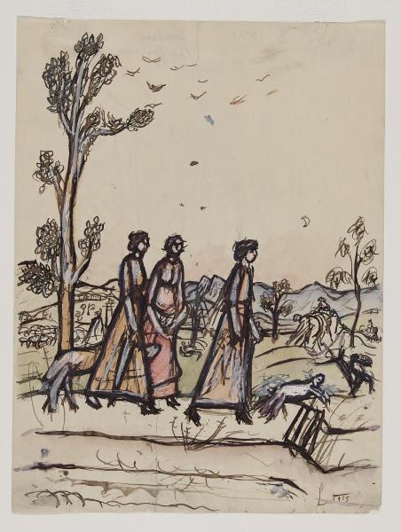 - NOTIZIE STORICO CRITICHE Il pittore raffigura tre contadine che camminano su una strada di campagna, attorniate da braccianti e pastori che portano al pascolo le loro greggi. Sullo sfondo il paesaggio montuoso lascia intendere che l’ambientazione descritta da Garbari sia quella della sua terra natia, il tanto amato Trentino. L’intelaiatura sintetica del disegno e il taglio dello schema figurativo inquadrano la scena e mettono a fuoco il contesto della comunità montana. Il segno è sintetico, schematico, svelto ma marcato e vigoroso. Come osservato da Arnalda Dallaj in questo foglio, "dall’accentuato antinaturalismo della linea volutamente elementare e semplificata", sono sintetizzati gli esiti delle ricerche artistiche di Garbari, maturate durante gli anni delle mostre a Venezia e a Firenze, prima del suo trasferimento nel 1915 a Milano (Dallaj 1991).