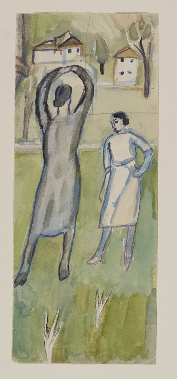 • NOTIZIE STORICO CRITICHE In questo disegno Garbari riduce il racconto all’essenziale, descrivendo due donne che si stagliano su uno sfondo popolato da alberi e case. Qui l’artista sembra aver subito la lezione del pittore Gino Rossi, conosciuto durante gli anni di studio a Venezia, presso l’Accademia di Belle Arti e punto di collegamento tra la pittura italiana e quella francese della Scuola di Pont-Aven. Il tratto delicato e i toni tenui di acquerello, resi con ampie macchie di colore puro e senza ombre, donano all’opera un sapore naturalistico, garbato ed elegante, in cui le due protagoniste dominano la scena con la loro grazia pacata e quieta.