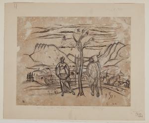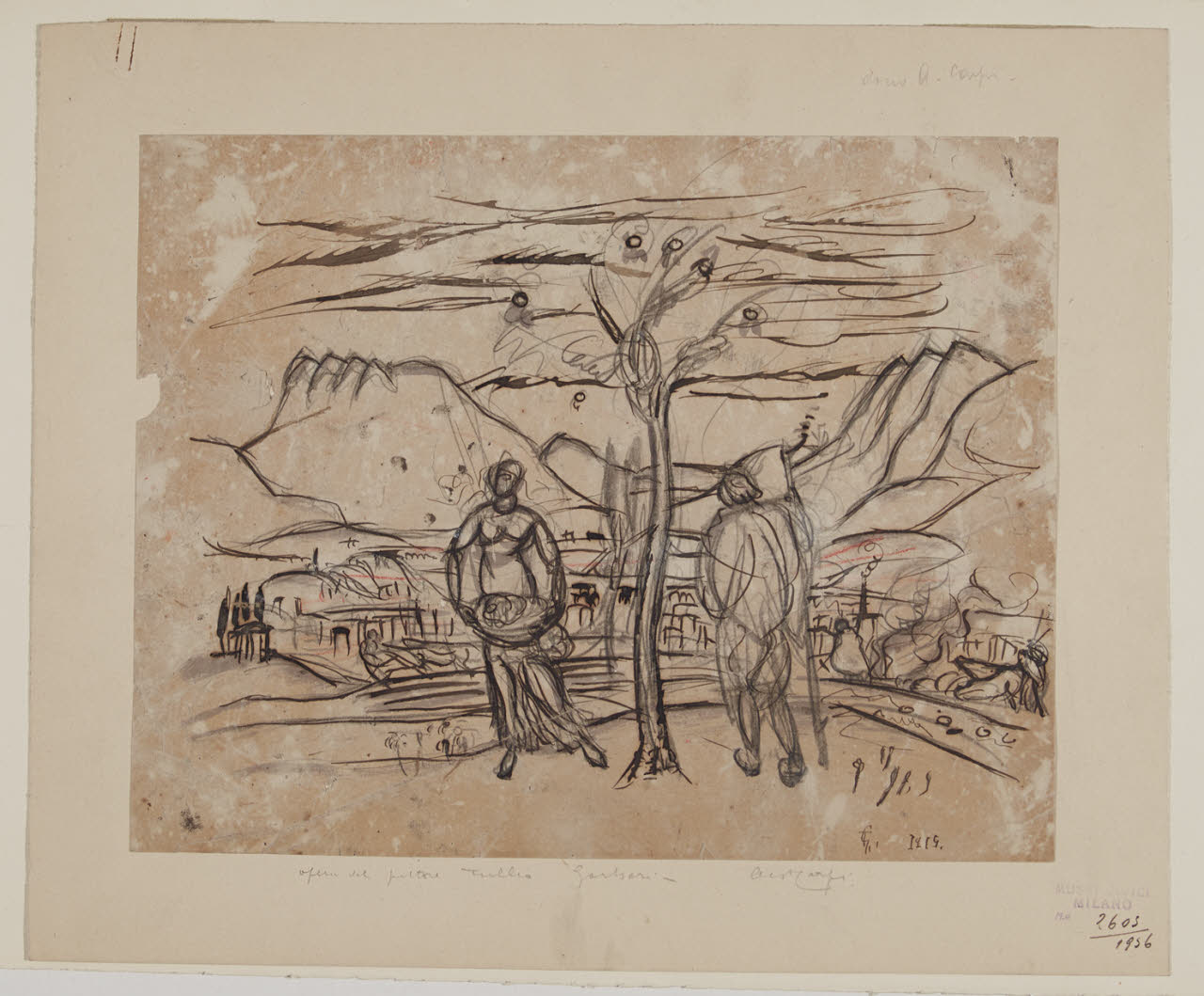 - NOTIZIE STORICO CRITICHE In questo disegno Garbari rappresenta una scena di vita quotidiana tra le montagne trentine. Sullo sfondo l’usuale paesaggio montano, costellato da piccoli agglomerati di villaggi, mentre al centro campeggia un albero e due figure ai suoi lati. L’uomo porta un attrezzo in mano, forse per cogliere i frutti dell’albero, la donna reca una cesta per raccoglierli. La scena sembra simbolicamente rievocare una danza attorno all’albero della cuccagna di tradizione nordica. Ma non è solo l’arte europea a ispirare il pittore, egli infatti guarda con attenzione anche alla produzione italiana dei cosiddetti artisti "primitivi". L’armonia compositiva tra i due personaggi invade l’intera opera e sembra metaforicamente illudere all’armonia universale della natura.