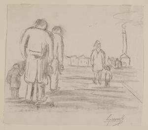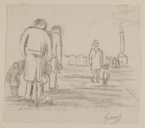 - NOTIZIE STORICO CRITICHE Di temperamento antiaccademico, dagli anni Trenta, Riccardo Gironi inizia la sua attività artistica insieme al gruppo dei pittori legnanesi denominati "i Candidi". Con questi alla Galleria del Milione, l'artista espone "Paesaggio urbano con figure", acquistato dopo la mostra nell'ottobre del 1931. Il foglio raffigura, in un ampio spazio aperto, l'architettura di una fabbrica con la sua ciminiera che fa da sfondo alla composizione. In primo piano sono descritti velocemente due uomini di spalle che tengono in mano un bambino e, al centro della scena, una donna che avanza. \nLe figure degli uomini in primo piano sono replicati in successione forse per sottolineare l'alienazione e l'omologazione della realtà in cui si trovano a lavorare, esprimendo così il tema sociale sulla società industriale che in quegli anni andava sviluppandosi sempre più in Lombardia (Vilardi 2001-2002).