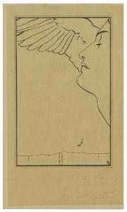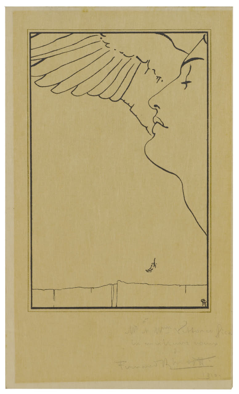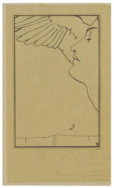 - NOTIZIE STORICO CRITICHE Attivo in tutti i campi dell'arte (dalla pittura alla scultura, dalle arti applicate alla grafica), il simbolista belga Fernand Khnopff si occupò nel corso della sua carriera anche di illustrazioni per l'editoria, realizzando frontespizi e immagini per testi poetici, libri e giornali. Le sue illustrazioni sono dei veri e propri motivi ornamentali così come lo è il foglio con L'ala. Questa piccola opera, nata molto probabilmente come immagine per l'editoria, è stata successivamente presentata nel corso dei primi anni Dieci nelle maggiori esposizioni belghe e nel 1912 alla Biennale di Venezia. Il disegno fu donato da Khnopff a Vittorio Pica, così come testimonia la scritta autografa (a "Messieurs Vittorio Pica les meilleurs voeux - Fernand Khnopff 1910") e successivamente venduto, nel 1931, all'asta delle opere possedute dal critico, dal quale l'opera è stata acquistata per le collezioni pubbliche milanesi. Pica, del resto, fu un grande stimatore dell'artista alle cui opere dedicò, già nei primi anni del Novecento, diversi saggi sulla rivista "Emporium". \nNel foglio, all'interno di un rettangolo nero riquadrato da una sottilissima linea dorata, uno splendido profilo femminile e una meravigliosa ala fanno capolino dal lato destro della composizione. Quasi come fosse il contorno di una miniatura, il disegno venne realizzato con un sottilissimo tratto d'inchiostro di china, netto e ben definito, che dona alla figura raffigurata una soave bellezza di carattere epico. Nell'angolo in basso a destra della composizione, inoltre, è presente il monogramma con il quale Khnopff era solito firmare i suoi lavori.