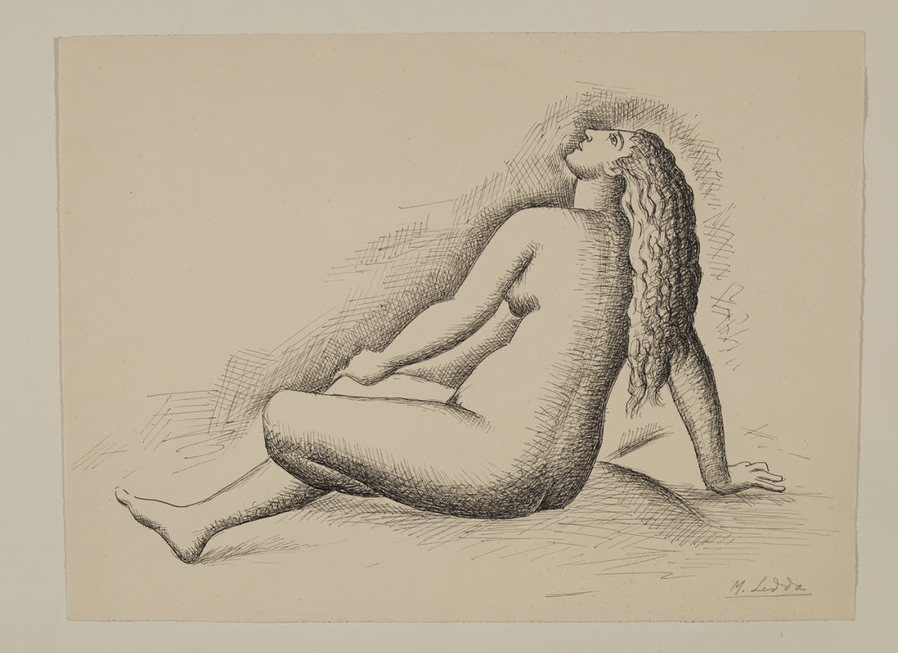 - NOTIZIE STORICO CRITICHE Alla fine della Prima Guerra Mondiale, dopo una serie di viaggi in Europa e Africa, Marius Ledda si sposta a Parigi e qui si avvicina alle correnti cubiste e surrealiste. Nel 1927 torna in Italia e, trasferitosi a Milano, espone nelle maggiori rassegne. Dal 3 al 17 aprile del 1933 è presente alla Galleria del Milione con una mostra personale, presentata all'interno del Bollettino numero 12 da Giorgio Nicodemi. Nel giugno dello stesso anno le raccolte milanesi acquistano dalla galleria un disegno dell'artista intitolato "Figura femminile, nuda, seduta" il cui titolo non risulta nell'elenco delle opere espose, ma la sua presenza è confermata dal timbro della galleria sul verso del foglio. La figura può essere confrontata con altre opere presenti nella stessa occasione e illustrate nel Bollettino; in particolare con la tela denominata "Bagnate". Nel disegno la donna è descritta attraverso un fitto intreccio di linee oblique che, oltre a creare un minuzioso gioco di luci e ombre, donano alla figura una volumetria massiccia che ricorda quelle di Léger. Ancora, i tratti del volto di profilo, la linea quasi retta della fronte e del naso, le onde della chioma dei capelli rimandano a elementi espressivi tipici di una cultura primitivista e antinaturale (Vilardi 2001-2002).