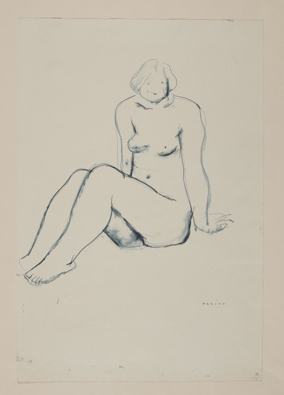 - NOTIZIE STORICO CRITICHE L'importante attività grafica di Marino Marini include un'innumerevole numero di disegni, incisioni, litografie e guazzi che, così come per le sue pitture o le sue sculture, mostrano come l'artista toscano non abbia abbracciato nessuna corrente stilistica ben definita. All'interno di questa vasta produzione due fogli appartenenti al periodo giovanile, differenti per stile e forma, sono conservati presso il Gabinetto di Disegni del Castello Sforzesco un "Nudo femminile giacente" (B 1641) acquistato presso la Galleria la Milano nel 1934 e uno studio con un "Nudo di donna seduta" comperato dall'artista nel 1931. In quest'ultimo foglio, Marini realizza con veloci tratti di inchiostro blu una goffa figura femminile seduta. Tale annotazione grafica è descritta attraverso una linea semplice e graffiante, sfumata nelle parti in ombra. Tra le opere grafiche dell'artista, nel 1983 vennero donati da Marina Marini un gruppo di disegni conservati presso il Museo Marino Marini della Galleria d'Arte Moderna di Milano.