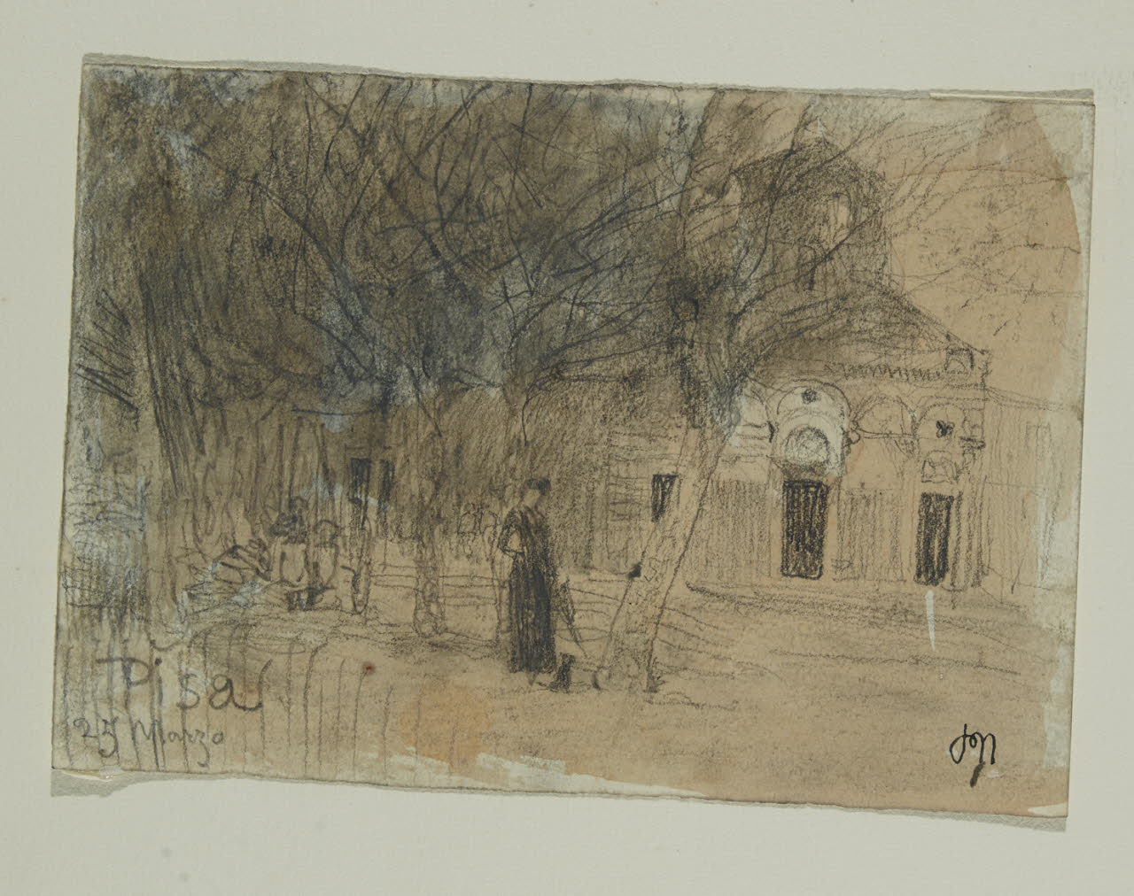 - NOTIZIE STORICO CRITICHE Gia dai primi anni fiorentini, Plinio Nomellini disegna instancabilmente in piccolissimi fogli di taccuino nel quale schizza con carboncino, matita o inchiostro tutto quello che osserva. In queste sue piccole opere su carta l’artista, anche in fasi alterne della sua produzione, mantiene caratteristiche formali molto spesso autonome rispetto ai suoi dipinti con una convergenza di soluzioni tutte personali che non permettono di datare con precisione questo genere di opere (G. Bruno, Plinio Nomellini, Milano 1985, p. 214). Pertanto l’assenza, anche in questo caso, di un’indicazione relativa alla datazione del disegno, a eccezione dell’iscrizione autografa "Pisa / 25 Marzo", non permette di stabilire con esattezza l’anno di esecuzione del foglio. Esso può comunque considerarsi come un appunto autonomo, un’annotazione grafica di una scena ripresa dal vero. Nel foglio, infatti, si può riconoscere la facciata della Chiesa di San Paolo a Ripa D’Arno a Pisa, nascosta da una serie di alberi posti sull’omonima piazza e al di sotto dei quali si trovano dei bambini e un’elegante donna che passeggia verso sinistra in una fredda giornata di primavera. In quest’opera Nomellini riesce a regalare attraverso diversi effetti di chiaroscuro e un incisività del segno, una soave intepretazionione lirica della città toscana. Il foglio, così come tutte le altre opere grafiche dell’artista, conservate presso il Civico Gabinetto di Disegni del Castello Sforzesco (invv. 4689 A 1644, 4691 A 1646, 4692 A 1647 Recto e Verso, 4693 A 1648), fu donato da Vittore Grubicy alle raccolte pubbliche nel 1920.
