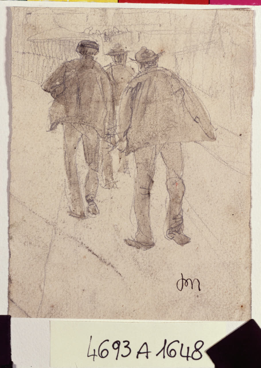 - NOTIZIE STORICO CRITICHE Sul finire dell'Ottocento l'opera di Plinio Nomellini è indubbiamente influenzata prima dalla pittura macchiaiola e successivamente da quella divisionista. Questo passaggio di stile è stato favorito dall'incontro con Alfredo Müller, con Pellizza da Volpedo e, dal 1901, con Vittore Grubicy che lo ricercherà chiedendogli dipinti e disegni nel corso di una folta corrispondenza (Quinsac 2005). Nelle opere del pittore livornese, in particolare quelle eseguite fino al 1894, i soggetti trattati rimandano a tematiche dal forte contenuto umano, sociale e politico che si riflettono non solo nei dipinti ma anche nelle opere di grafica le quali, a loro volta, rivelano caratteristiche autonome: raffigurazioni dal vero, fabulazione di idee o vere e proprie realizzazioni a se stanti (cfr. G. Bruno, Plinio Nomellini, Milano 1985). In piccoli fogli di taccuino l'artista annota a matita, a penna o con pastelli colorati, con stile sintetico ma robusto, i rappresentanti del proletariato, gli operai e i miserabili, i lavoratori che escono o si recano a lavoro. Questi appunti furono certamente utilizzati poi come monito per le figure di uomini a lavoro o in corteo e si trovano nei suoi dipinti più famosi come "Lo Sciopero" del 1889, "Piazza caricamento" del 1891 e "La diana del lavoro" del 1893 nel quale sono raffiguranti operai, contadini o semplici figure in strada. Per il disegno a matita i "Viandanti" conservato al Castello Sforzesco si propone una datazione tra il 1889-1894, per il confronto stilistico con altre opere grafiche del periodo. Nel foglio in esame le figure ritratte di spalle sembrano percorrere a passo spedito una strada in salita tracciata da due linee parallele. Il segno della matita che delinea le tre figure è sciolto e veloce, testimonianza dell'avvicinarsi a un'espressività più libera dai postulati compositivi e grafici della pittura macchiaiola. Il disegno fu donato da Vittore Grubicy alle raccolte pubbliche nel 1920 e testimonia dell'ammirazione reciproca tra l'artista e il mercante d'arte.