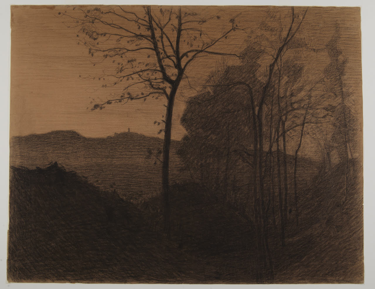 - NOTIZIE STORICO CRITICHE Il disegno è datato da Teresa Fiorio in "Archivi del Divisionismo" all'incirca al 1906, ed è anticipato di qualche anno tra il 1903 e il 1904 da Aurora Scotti che lo cita nei suoi numerosi studi sull'artista come "Paesaggio con la collina di Monleale sul fondo", riconoscendovi in esso le campagne attorno a Volpedo, dove il pittore era solito soffermarsi a disegnare. Nell'ultimo periodo delle sua vita, infatti, Giuseppe Pellizza si interessò particolarmente a questo genere figurativo, studiando numerosi paesaggi collinari, e in particolar modo al crepuscolo, creando delle intense composizioni paesaggistiche fatte da sottili rapporti luminosi che sottolineano il suo interesse per le fasi astrali del sole. \nIl foglio presenta una successione di piani caratterizzati da una luminosità crescente ottenuta per mezzo di una diversa modulazione del tratto del carboncino che crea la percezione di una prospettiva aerea.\nCosì al fitto intreccio di linee in primo piano, segue via via un loro diradarsi, nella rappresentazione di una variegata vegetazione e di spogli arbusti che si stagliano sulle vallate nello sfondo.