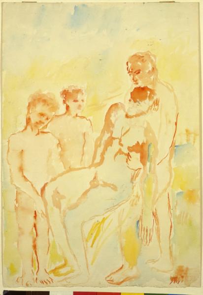 - NOTIZIE STORICO CRITICHE Il dramma della morte di Cristo è uno dei temi che più appassionarono il pittore milanese tra il 1932 e il 1933 e sul quale ritornò qualche decennio dopo. Alla fine degli anni Cinquanta, all'interno del catalogo della personale tenuta alla Galleria San Fedele, è lo stesso Sassu a descrivere i motivi che lo avevano condotto a interessarsi alla rappresentazione del sacro, e in modo specifico al ciclo della Passione. Egli scrive: "il tema della morte di Cristo è ricorrente nel mio lavoro, con un'insistenza ossessiva. È questo un tema attorno al quale la mia fantasia lavorava, quasi un configurarsi della urgente tragica condizione dell'uomo, dell'uomo della mostra epoca... quel ponte che dalla nascita dell'uomo ci conduce passo passo alla morte è come una vena viva di sangue che si rivela in tutti i suoi elementi di sacro, di tragico, di grottesco, ma sempre lo specchio della nostra umanità, della nostra ansia del vero, dell'essere uomini veri... queste premesse di ordine estetico non sono staccate dal grave e profondo contenuto di questo problema veramente universale che è la via Crucis". \nDopo aver esposto, nel 1932, una "Deposizione" alla Galleria del Milione, Sassu torna con insistenza sul tema. Di questo soggetto infatti il Gabinetto di Disegni del Castello Sforzesco conserva due opere su carta: una "Deposizione" realizzata a sanguigna (sul cui verso è presente uno studio della stessa in controparte, eseguita attraverso un semplice tratto di sanguigna, invv. 6346 E 125 Recto e Verso) e un "Cristo deposto" eseguito ad acquerello (inv. 6347 C 850). Entrambe le opere furono acquistate direttamente presso l'artista rispettivamente nel 1933 e il 1934. Pur differenziandosi per tecnica esecutiva, sono accomunate da quella forte tensione emotiva "affidata alla suggestione del rapporto linea-colore in scoperta antitesi con i canoni del novecentismo" (Dallaj 1991). \nLa "Deposizione" ripropone modi arcaizzanti legati alla tradizione dell'arte italiana ed è presentata con un tratto tenue e sfumato della sanguigna. Quest'ultima, descrive le ombre dei cinque corpi nudi sottolineando maggiormente il perimetro che le descrive. A esso l'artista sovrappone il tratto di matita rossa che ne accentua la volumetria. Viceversa, nel "Cristo deposto", Sassu adotta un linearismo decorativo di ascendenza matissiana-espressionista, componendo le figure attraverso le sole linee di contorno. Fluidi tratti di acquerello color arancio delimitano le figure della scena, mentre tutto intorno veloci pennellate acquose cospargono lo spazio circostante con un azzurro tenue, un acceso giallo limone e tocchi di verdastro. Questi ultimi contribuiscono ad accentuare quell'esperienza emozionale del colore che l'artista cercava.