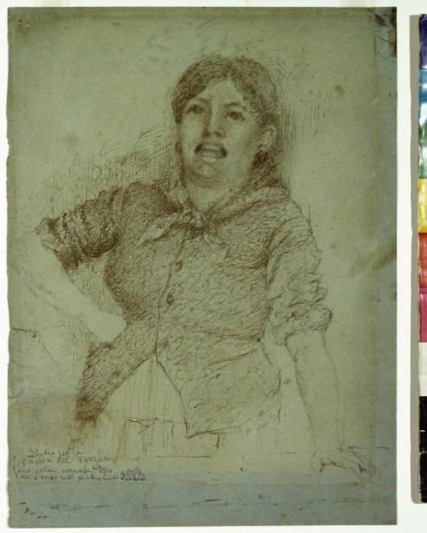 - NOTIZIE STORICO CRITICHE Entrato nella scuderia di Vittore e Alberto Grubicy già dal 1880, Giovanni Segantini fino al 1886 tratta nelle sue opere tematiche principalmente veriste con figure, paesaggi e nature morte. \nSu questa scia, ispirandosi al poemetto in dialetto milanese di Carlo Porta (1776-1821) La Ninetta del Verzée, realizza una tela a olio. Ninetta nell'opera del poeta è una pescivendola, che a causa di una triste vicenda è costretta a vendere il banco al mercato del Verziere di Milano e a prostituirsi. Nel quadro di Segantini la protagonista della storia è descritta come una giovane e robusta venditrice di pesce e verdure, che da dietro il banco della mercanzia richiama sorridente la sua clientela. L'interpretazione della posa e dell'espressione della donna, caratterizzata da un vivace naturalismo, visibile in particolare nella resa della natura morta, dona all'opera un realismo fortemente espressivo. Quest'ultima infatti, così come già osservato dalla critica si discosta profondamente dalle tendenze romantiche proposte dalla pittura scapigliata (Quinsac 1982), tanto che lo stesso Primo Levi la descrive come un "allegro canto delle esequie per la morte della pittura di genere" (Nicodemi 1956). \nL'opera rimanda al suo disegno preparatorio, uno dei rari casi di studio che ci rimangono del pittore, il quale è realizzato con sottilissimi ma vigorosi tratti di inchiostro scuro su carta azzurra, e fu donato alle Civiche Raccolte milanesi da Vittore Grubicy nel 1920. Segantini nell'opera grafica, concentrandosi solo sullo studio della figura, presenta un impianto compositivo più essenziale rispetto al dipinto, grazie anche alla scelta di eliminare gli elementi accessori dello spazio circostante, e ciò si traduce in una maggiore immediatezza espressiva dei caratteri di sfrontatezza e sicurezza della donna.\nDalle iscrizioni autografe sul recto e sul verso del foglio a opera di Vittore Grubicy e Emilio Longoni, si apprende, inoltre, che la ragazza che posa come modella è la cognata del pittore, Caterina Bugati, una delle sorelle maggiori di Bice, sua consorte. Queste le parole di Grubicy scritte sul foglio: "Studio per la Ninetta del Verzee fatto colla cognata Osio VGDD"; e quelle del pittore Emilio Longoni: "Disegno della pescivendola di Giovanni Segantini, non firmato ma suo, la modella è Carolina, sorella della signora Segantini".\nIl foglio, per la particolare qualità del segno e per l'età della modella, è stato datato da Annie-Paule Quinsac, al 1882, posticipando così di tre anni la datazione delle due opere, tradizionalmente ascritte dalla critica al 1879 (Quinsac 1982). \nOltre a queste, un anno dopo l'esecuzione del dipinto, l'artista realizza un altro disegno, oggi disperso, del tutto simile alle opere precedenti; quest'ultimo probabilmente usato come base per un'acquaforte e pubblicato in quello stesso anno ne "L'Illustrazione italiana" e nell' "Album ricordo dell'Esposizione romana" (Ivi. p. 120).