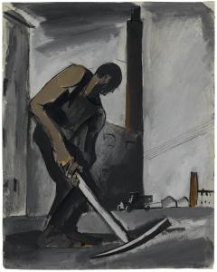 - NOTIZIE STORICO CRITICHE Già agli inizi degli anni Venti le opere di Mario Sironi si contraddistinguono per la rappresentazione di una serie di paesaggi urbani che si discostano dalla visione lirica della campagna bucolica per esprimere, invece, quel nuovo senso di realtà ispirato dalla modernizzazione della società, le cui nuove città sono entità vuote, periferie spettrali in cui l'umiliata classe operaia vive all'interno di case-fabbrica dall'aspetto cupo e asettico. Attraverso queste creazioni il pittore compie un'acuta quanto esplicita critica delle problematiche connesse al processo d'industrializzazione della società e del conflittuale rapporto tra l'individuo e la città moderna. Oltre a una serie di opere in cui il soggetto è costituito da grigi e rarefatti paesaggi urbani attraversati da camion e tram, vi sono altri esempi in cui questi ultimi fanno invece da sfondo enfatizzante alle figure in primo piano. È il caso della piccola tempera su carta con "l'Allegoria dell'espansione urbanistica" del Gabinetto di Disegni del Castello Sforzesco, acquistata presso la moglie dell'artista per le raccolte pubbliche nel 1933. Nel disegno, il senso di fatica e di disagio vengono espressi attraverso la rappresentazione del lavoratore in primo piano, nell'accentuazione della squallida desolazione di un insediamento industriale che fa da sfondo, e dall'atto distruttivo del piccone brandito dall'uomo. Anche in questo caso "la tornitura plastica e tattile delle figure, la complessità degli sfondi e delle architetture, la ricchezza simbolica e allegorica" (A. Sironi, Disegni, in Mario Sironi, catalogo della mostra, a cura di F. Benzi, Milano 1993, p. 372) si racconta attraverso la variazione dell'uso del colore che da meticoloso si fa impreciso, accompagnato da sottili linee di inchiostro che esaltano la volumetria della figura umana.